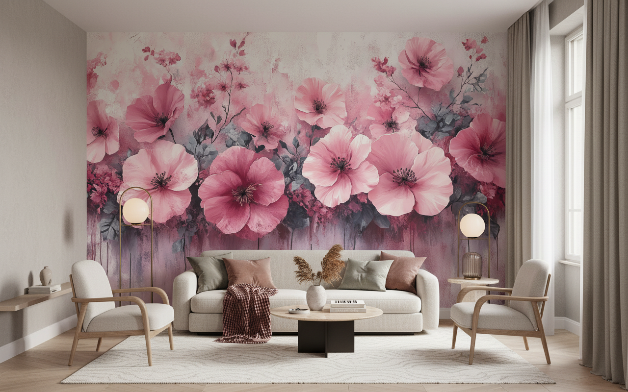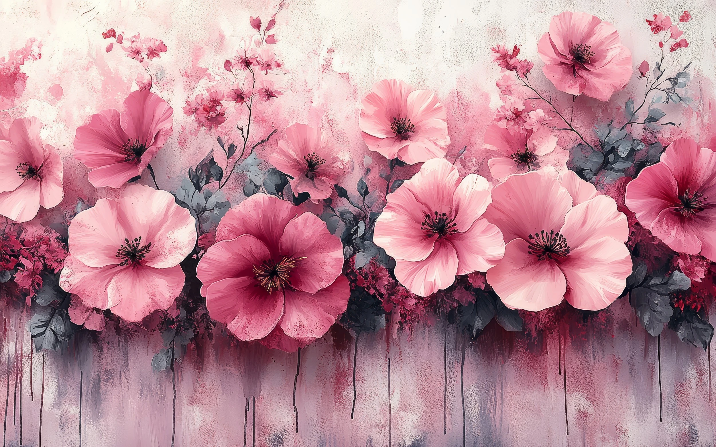 Ce papier peint floral aquarelle révèle un jardin romantique d’une beauté saisissante, où s’épanouissent de majestueuses fleurs roses aux corolles généreuses. Les hibiscus et coquelicots stylisés dansent gracieusement sur la surface murale, leurs pétales délicatement ourlés captant la lumière comme des fragments de soie précieuse. Le style aquarelle confère à l’ensemble une douceur vaporeuse, où les couleurs se fondent harmonieusement dans des dégradés subtils allant du rose poudré au corail intense, ponctuées de touches bordeaux et de gris anthracite pour les feuillages.