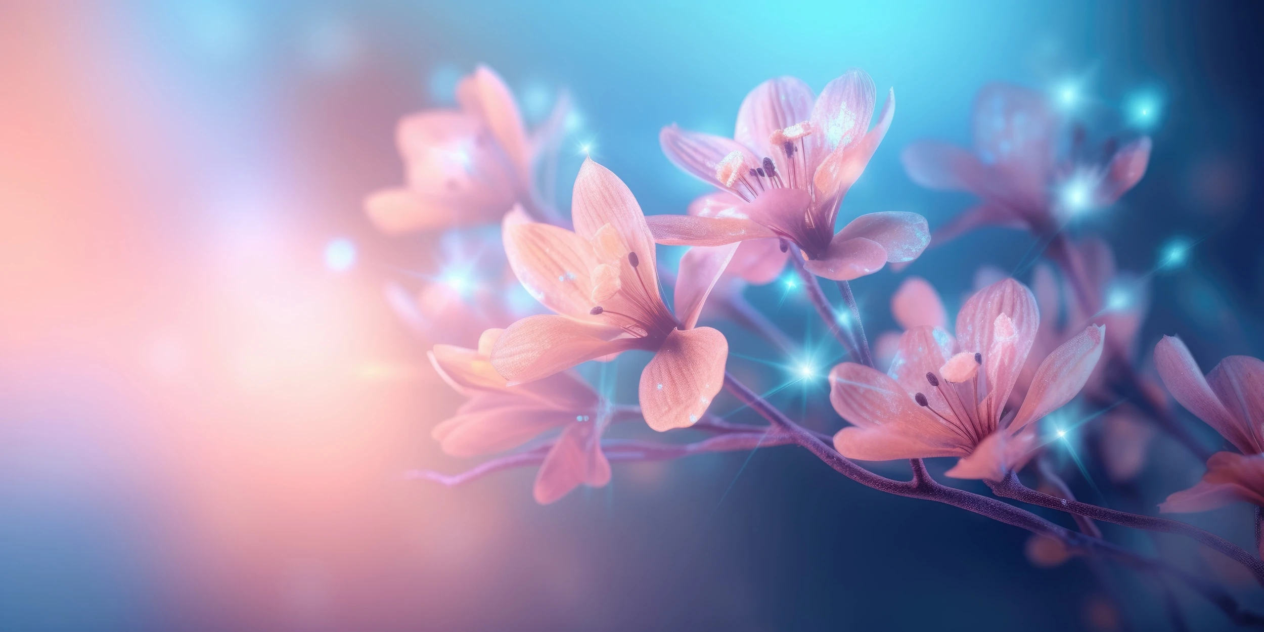 Cette création artistique révèle de magnifiques fleurs liliacées aux formes gracieuses, chacune déployant ses six pétales veinés avec une délicatesse remarquable. Les étamines sombres contrastent subtilement avec la douceur des corolles, créant un équilibre visuel parfait. L’ensemble se détache sur un fond dégradé rose et bleu, ponctué de points lumineux scintillants qui évoquent la rosée matinale ou la magie d’un crépuscule enchanté.