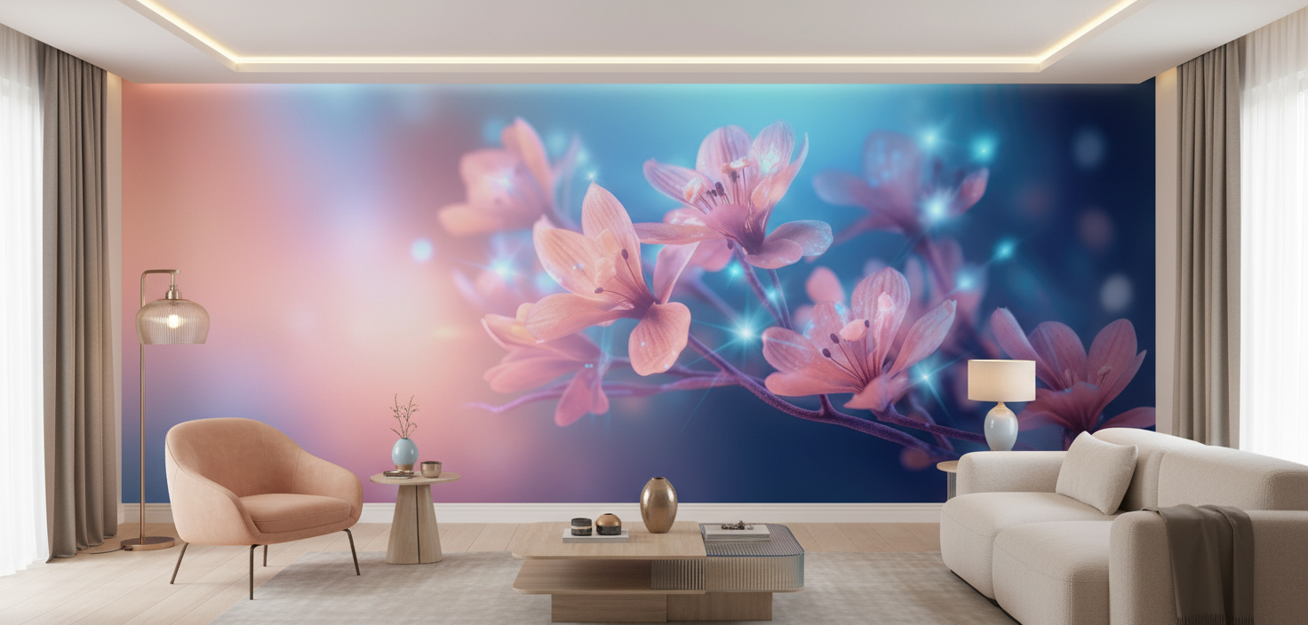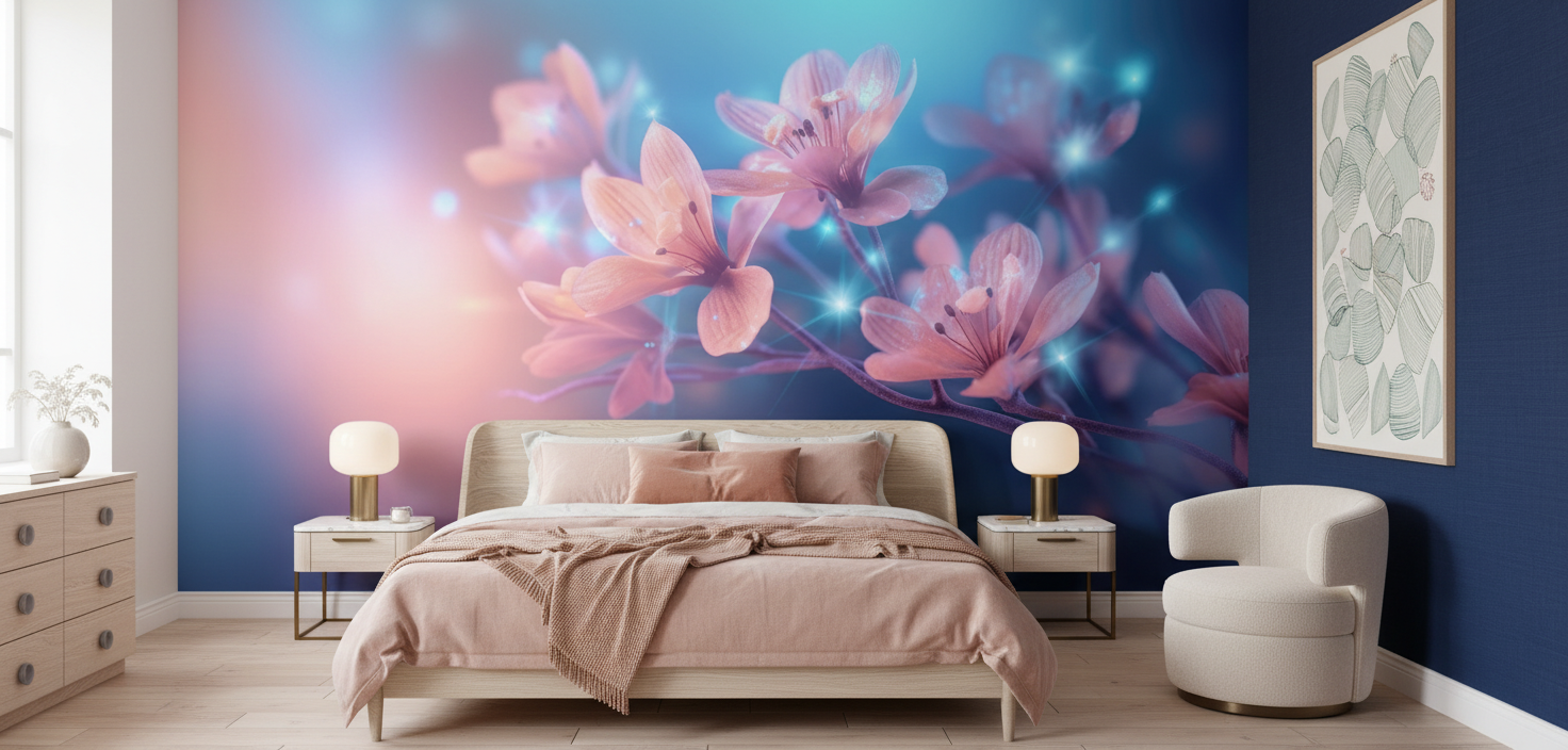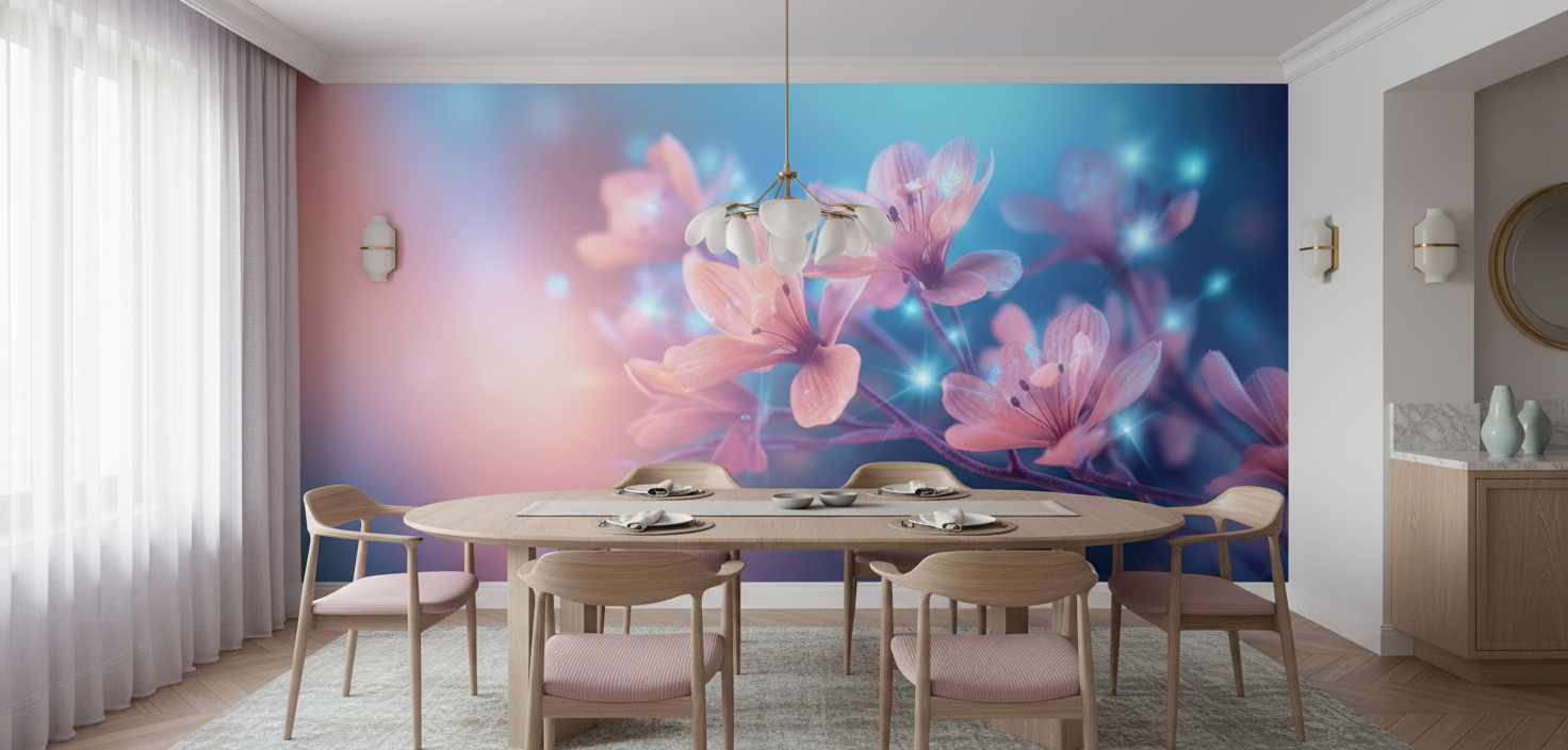 Le traitement photographique de ce papier peint moderne sublime la beauté naturelle par des effets de lumière diffuse et de profondeur de champ, créant une atmosphère onirique. Les tons pastel rose poudré se marient harmonieusement avec les nuances turquoise et lavande, offrant une palette chromatique d’une rare sophistication. Cette décoration murale florale transcende le simple motif pour devenir une véritable œuvre d’art contemporaine.
