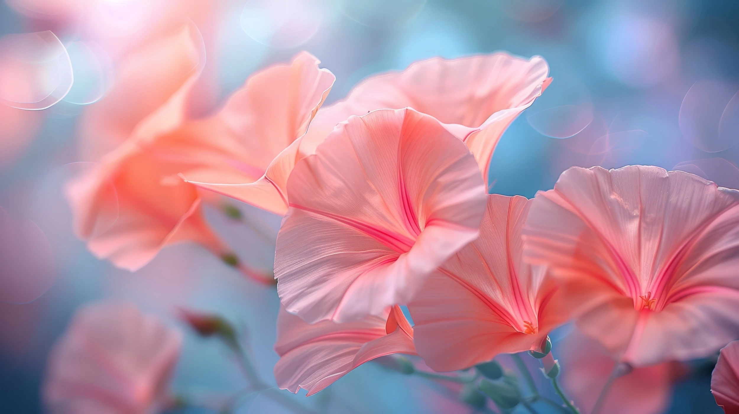 Laissez-vous porter par la douceur éthérée de ces fleurs délicates qui semblent danser dans une lumière nacrée, créant une symphonie visuelle où le rose poudré rencontre l’azur infini.