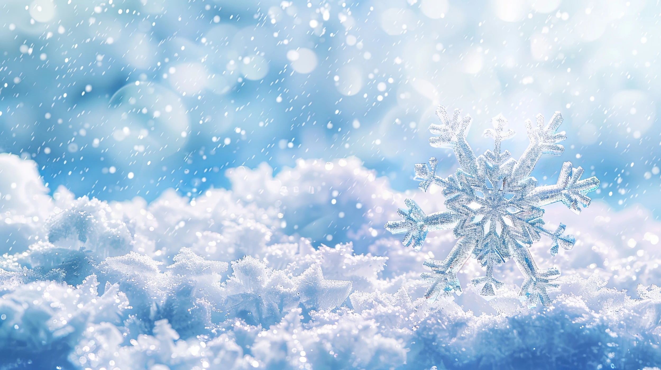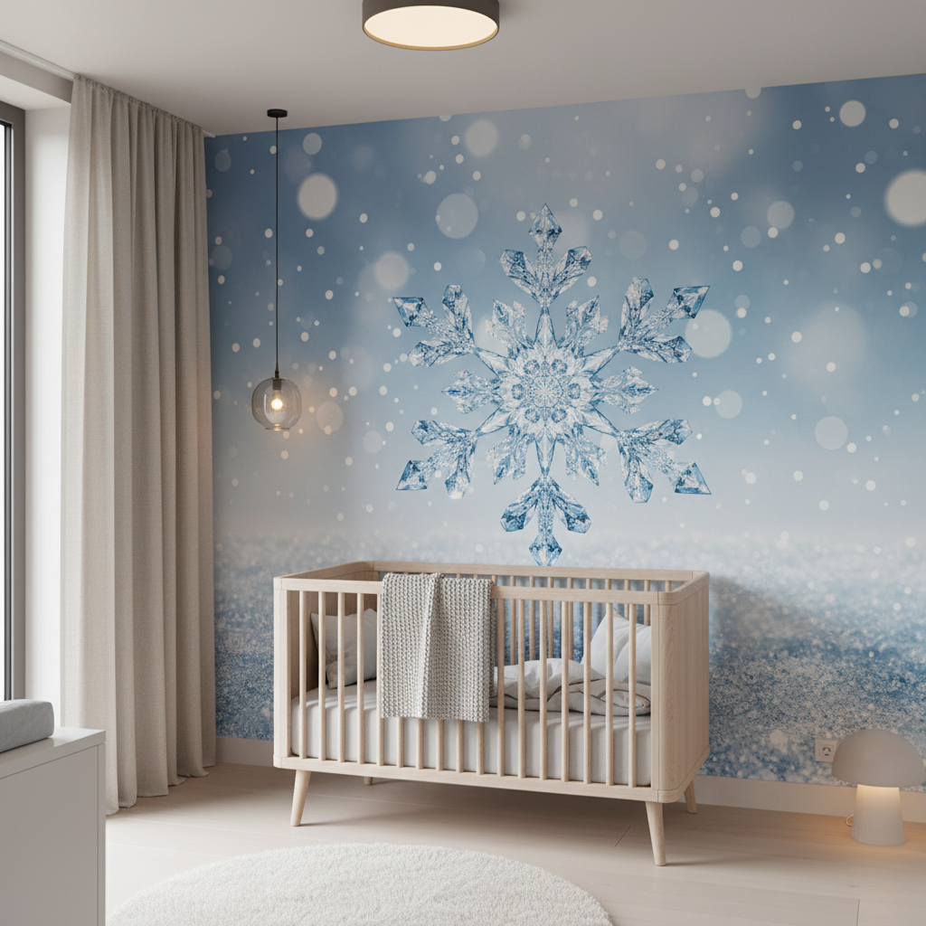 Ce papier peint hivernal capture avec une délicatesse saisissante l’essence même de la saison blanche. Au premier plan, un flocon de neige aux détails ciselés trône majestueusement sur un tapis neigeux aux reflets nacrés, tandis qu’une multitude de cristaux scintillants voltigent dans l’air glacé. L’ambiance photographique réaliste de ce design révèle chaque détail : la texture poudrée de la neige fraîchement tombée, la structure hexagonale parfaite du flocon principal, et cette lumière douce et bleutée caractéristique des paysages enneigés. La palette chromatique s’articule autour de tons blancs immaculés, de nuances bleu glacier et de reflets argentés, créant une harmonie visuelle d’une pureté absolue.