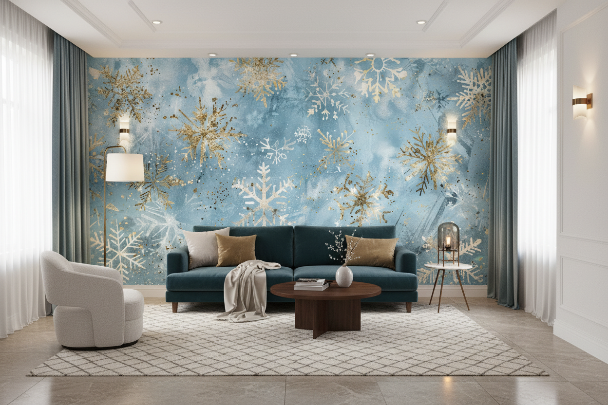 Sublimez votre intérieur avec ce papier peint flocons dorés. Un ballet cristallin sur fond bleu aquarelle pour une ambiance hivernale chic. Créez un décor apaisant et raffiné, entièrement sur mesure.