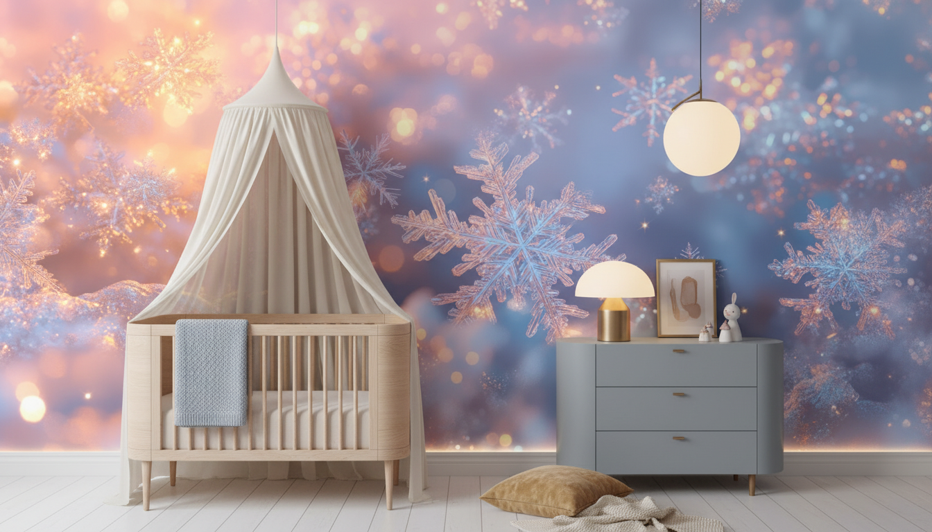 Laissez-vous envoûter par la magie d’un papier peint flocons de neige où chaque cristal semble danser dans une symphonie de lumière dorée et d’azur givré, transformant votre intérieur en un cocon féerique baigné de douceur hivernale.