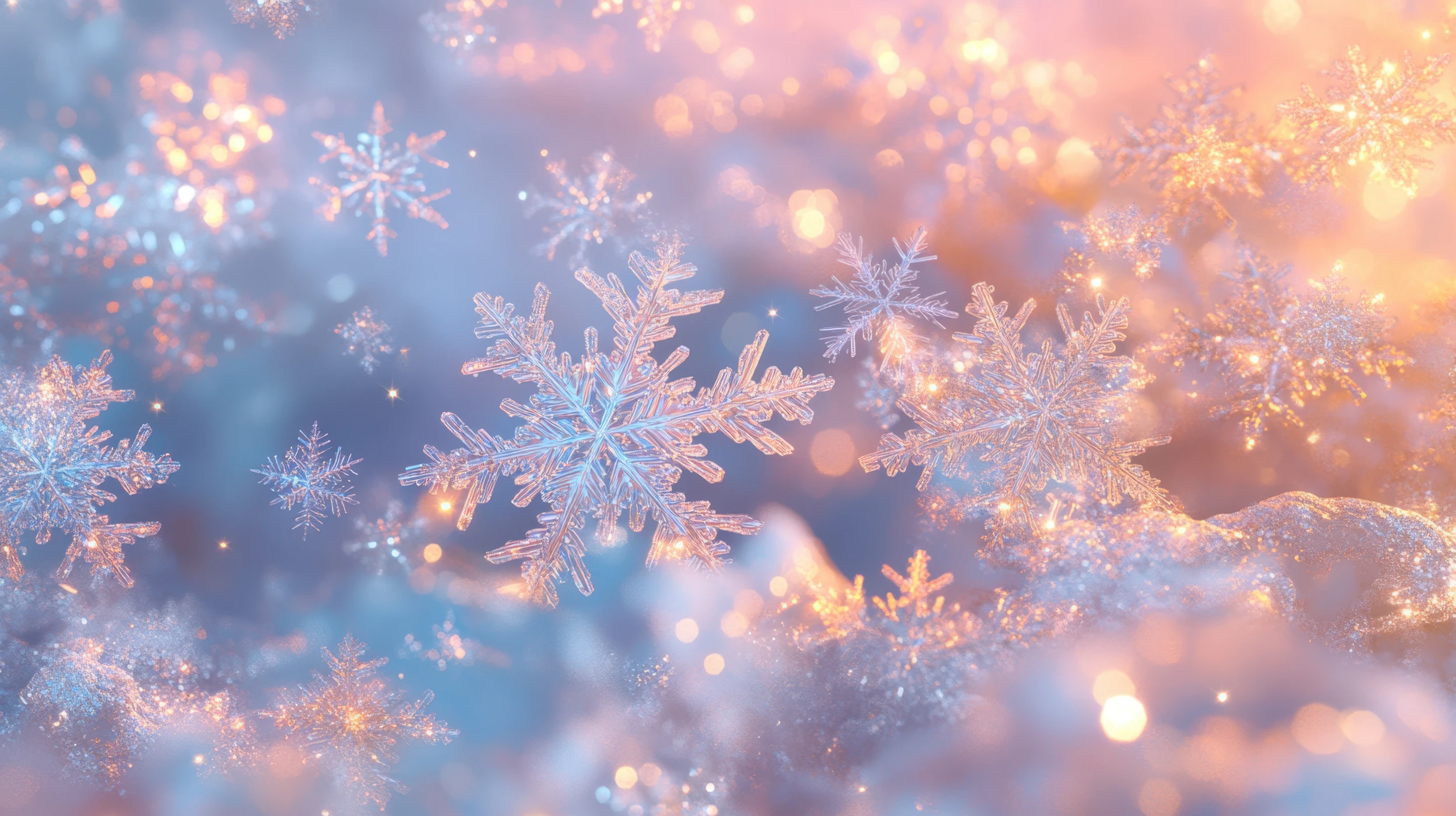 Ce papier peint hiver d’exception révèle une composition artistique d’une rare délicatesse, où des flocons de neige cristallins aux détails ciselés se détachent avec une précision saisissante. Chaque cristal de glace reproduit fidèlement la géométrie parfaite de la nature, avec ses branches dendritiques finement ramifiées qui captent et réfléchissent la lumière comme de véritables bijoux glacés. L’ensemble baigne dans un effet bokeh lumineux somptueux, où se mêlent harmonieusement des tons dorés chaleureux et des nuances bleu pastel, créant une profondeur visuelle envoûtante. Des particules scintillantes parsèment l’arrière-plan, évoquant la magie d’une tempête de neige dorée sous les premiers rayons du soleil matinal.