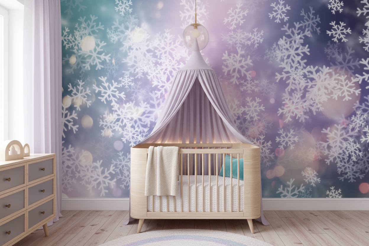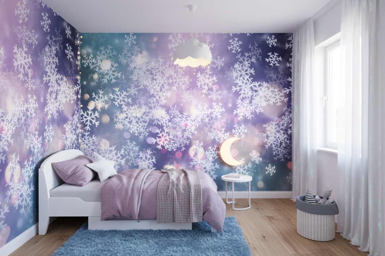 Ce papier peint flocons de neige révèle un univers féerique où chaque cristal de glace se déploie avec une précision géométrique saisissante. Les motifs de flocons aux formes variées et sophistiquées s’épanouissent sur un fond aux dégradés pastel sublimes, mêlant harmonieusement les tons bleu glacier, les nuances lilas et les reflets turquoise. Cette palette chromatique douce et apaisante évoque les aurores boréales et les paysages enneigés d’un conte de fées moderne.