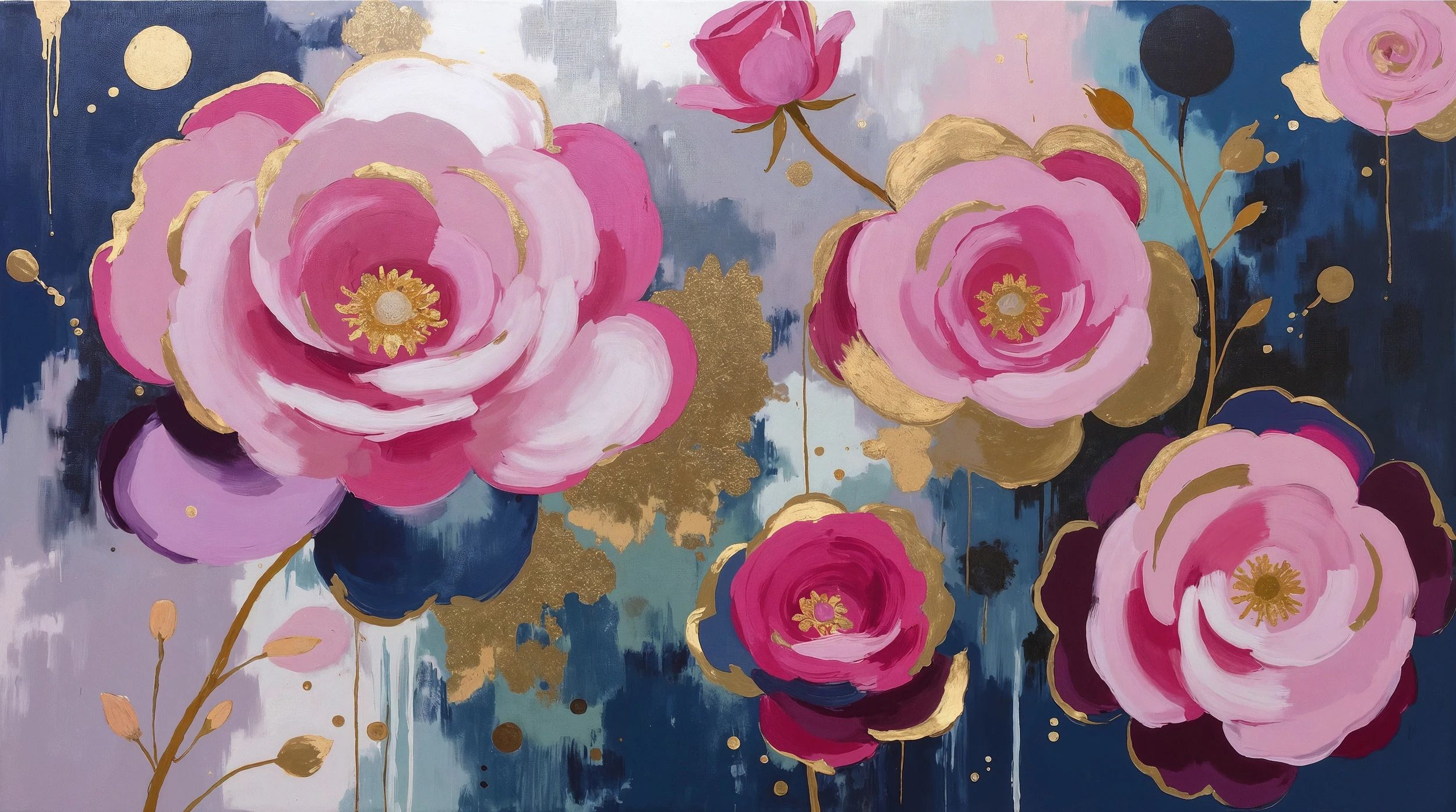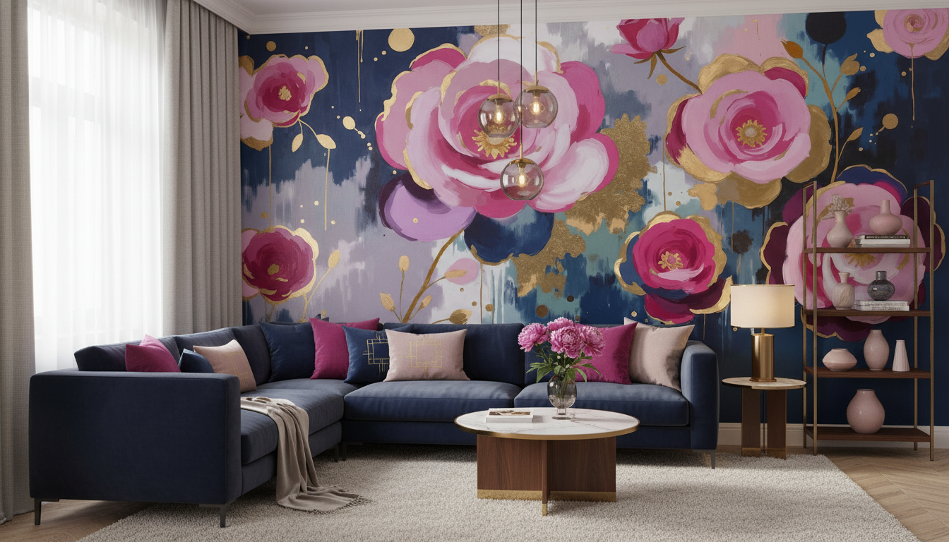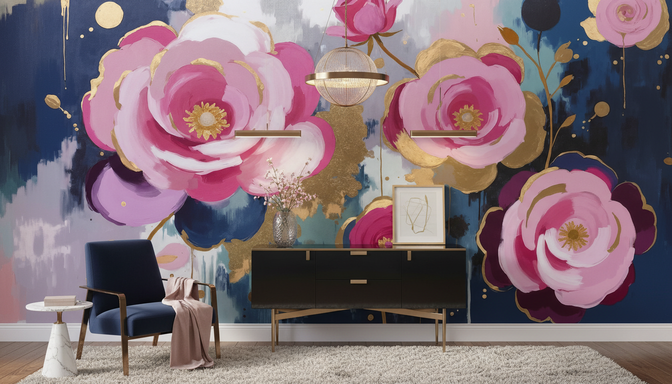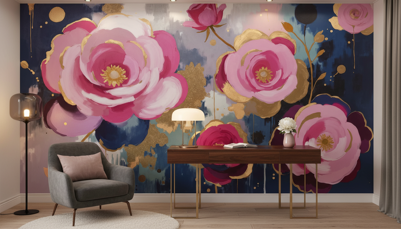 La technique picturale évoque l’aquarelle moderne, où les couleurs se fondent harmonieusement dans des effets de transparence et de superposition. Les fleurs stylisées semblent flotter avec grâce, accompagnées de feuillages dorés et de petites touches colorées qui créent un rythme visuel captivant. Cette peinture florale contemporaine transforme chaque pan de mur en véritable œuvre d’art.