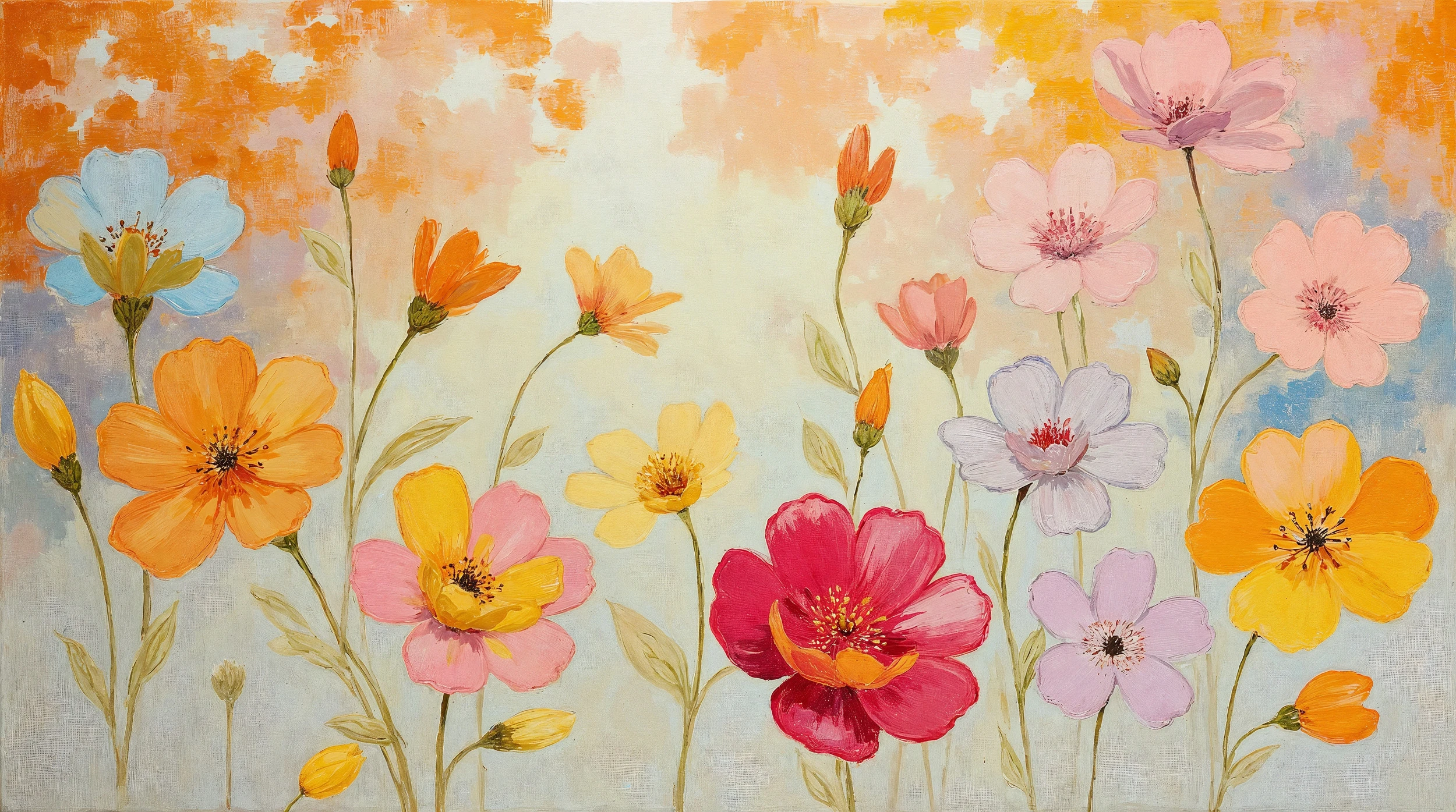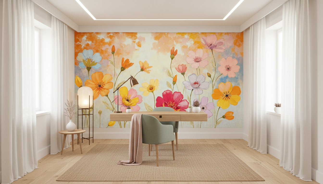 L’arrière-plan se pare d’un ciel impressionniste aux nuances automnales, créant une profondeur atmosphérique qui enveloppe ces fleurs des champs dans une lumière chaleureuse et bienveillante. Cette fresque murale florale respire la liberté et la joie de vivre, insufflant à votre espace une énergie positive et revitalisante.