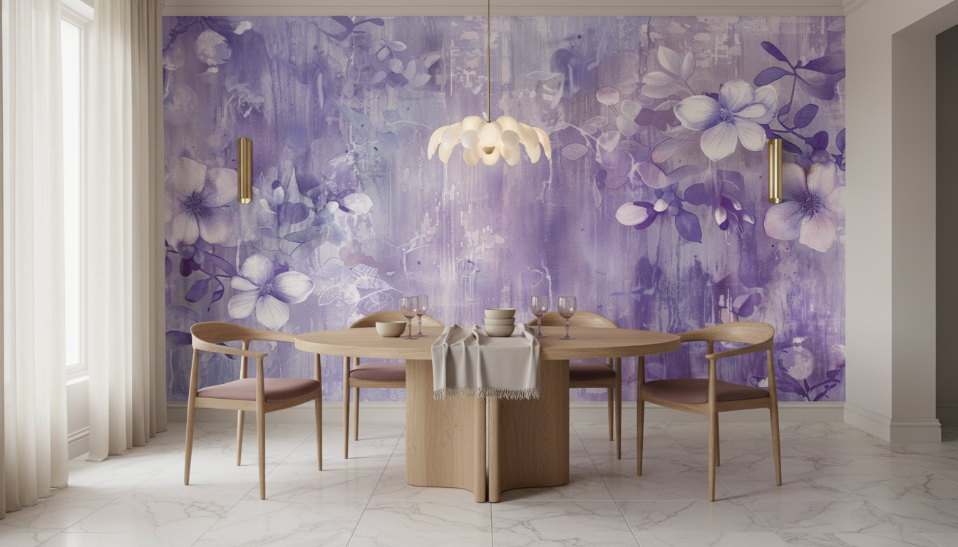 La palette chromatique explore toutes les nuances du violet pastel, du lilas poudreux aux tons améthyste plus soutenus, créant une harmonie colorielle d’une sophistication rare. Les effets de dégradé aquarellé apportent une dimension picturale unique, tandis que les coulures artistiques évoquent la spontanéité de la peinture fraîche sur papier. Cette esthétique florale contemporaine transcende les codes traditionnels du papier peint pour devenir une véritable œuvre murale.