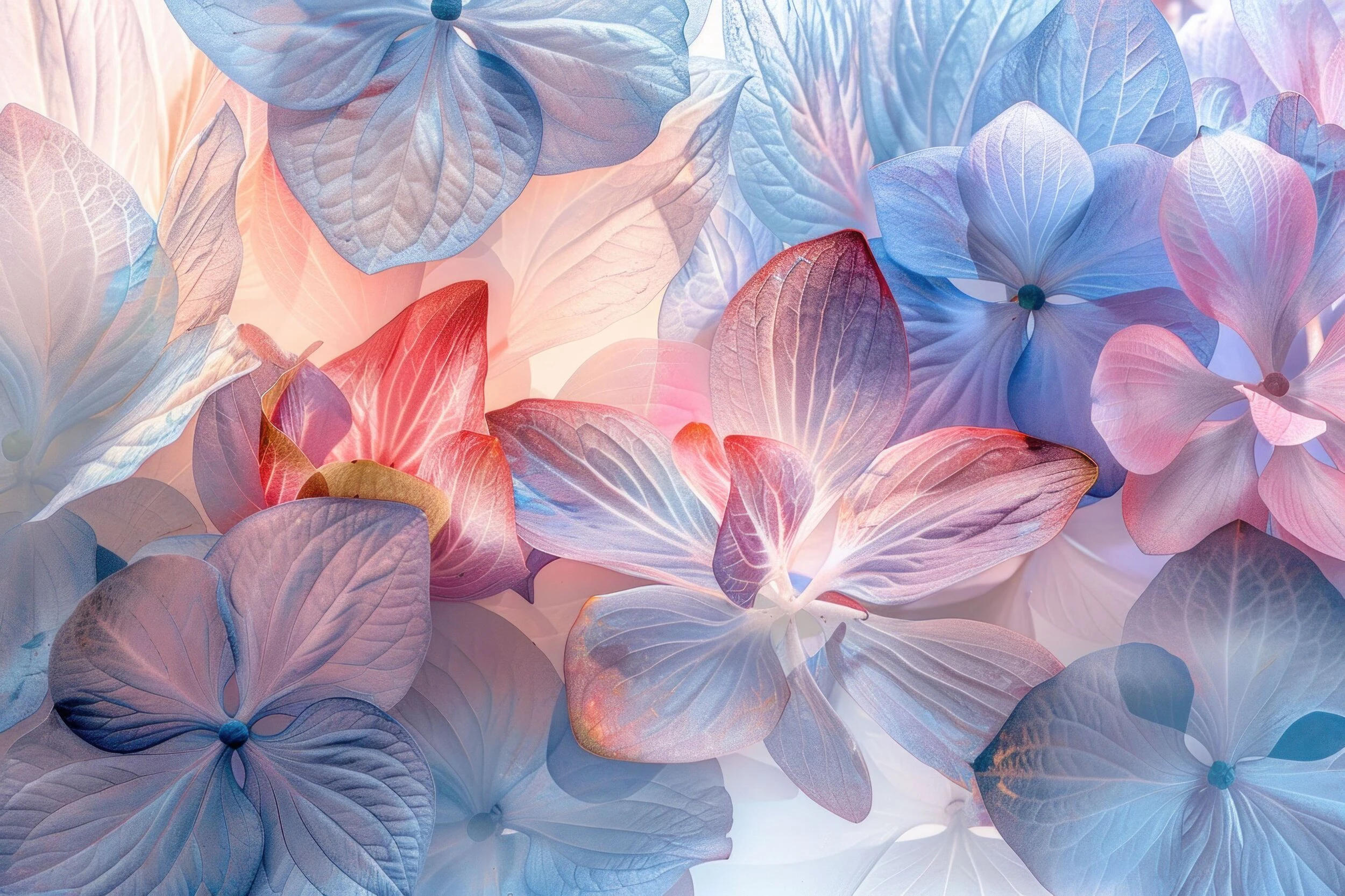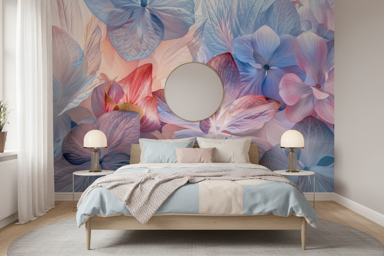Cette création artistique révèle un motif floral d’exception, composé de magnifiques fleurs aux pétales translucides qui semblent capturer la lumière pour la diffuser en douces iridescences. Les tons pastel se mêlent harmonieusement, passant des bleus poudrés aux roses nacrés, rehaussés par des touches de rouge corail et de violet améthyste. Chaque pétale délicat révèle des nervures finement ciselées, créant une texture visuelle d’une richesse extraordinaire. Le style graphique s’apparente à un art numérique raffiné, mêlant la précision du dessin vectoriel à la sensualité de l’aquarelle digitale.
