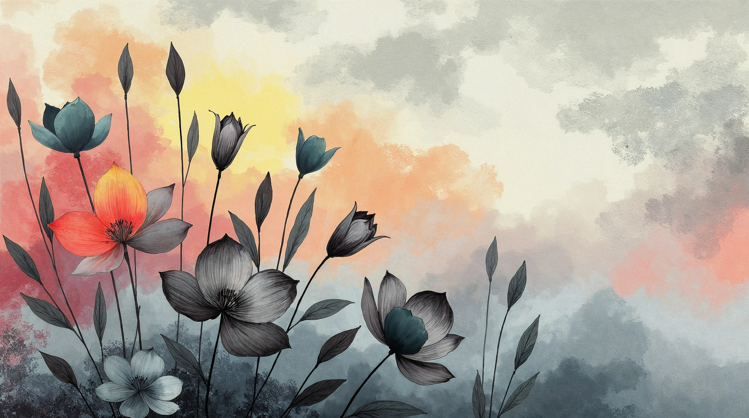 Cette création artistique révèle un motif floral sophistiqué aux allures de peinture à l’aquarelle. Des fleurs stylisées aux pétales délicatement ombrés s’élèvent sur leurs tiges élancées, créant une composition verticale d’une élégance remarquable. Les corolles se déclinent dans une palette raffinée mêlant gris anthracite, bleu-vert céladon et touches corail qui réchauffent l’ensemble. L’arrière-plan se pare de nuances pastel – rose poudré, jaune tendre et gris perle – qui évoquent la douceur d’un ciel matinal teinté des premières lueurs du jour.