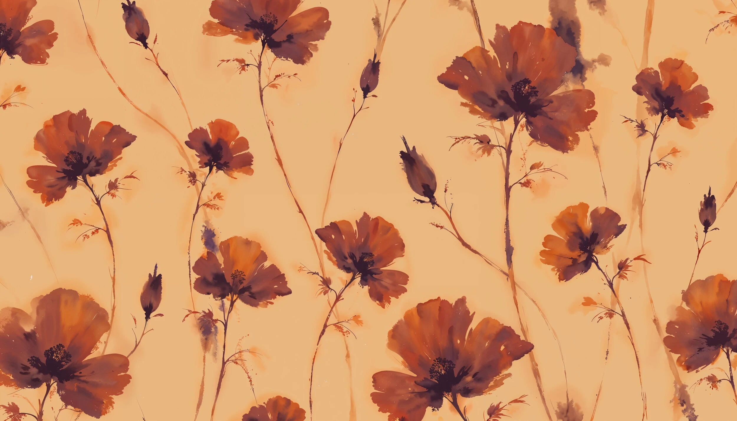 Ce papier peint floral dévoile un univers botanique d’une délicatesse infinie, où se mêlent harmonieusement fleurs épanouies et boutons délicats dans une symphonie de tons chauds. Les motifs, réalisés dans un style aquarelle moderne, révèlent des fleurs aux pétales généreux déclinées en nuances d’orange brûlé, de rouge terre de Sienne et de brun chocolat, tandis que les tiges élancées et les petites graminées apportent une verticalité gracieuse à l’ensemble.