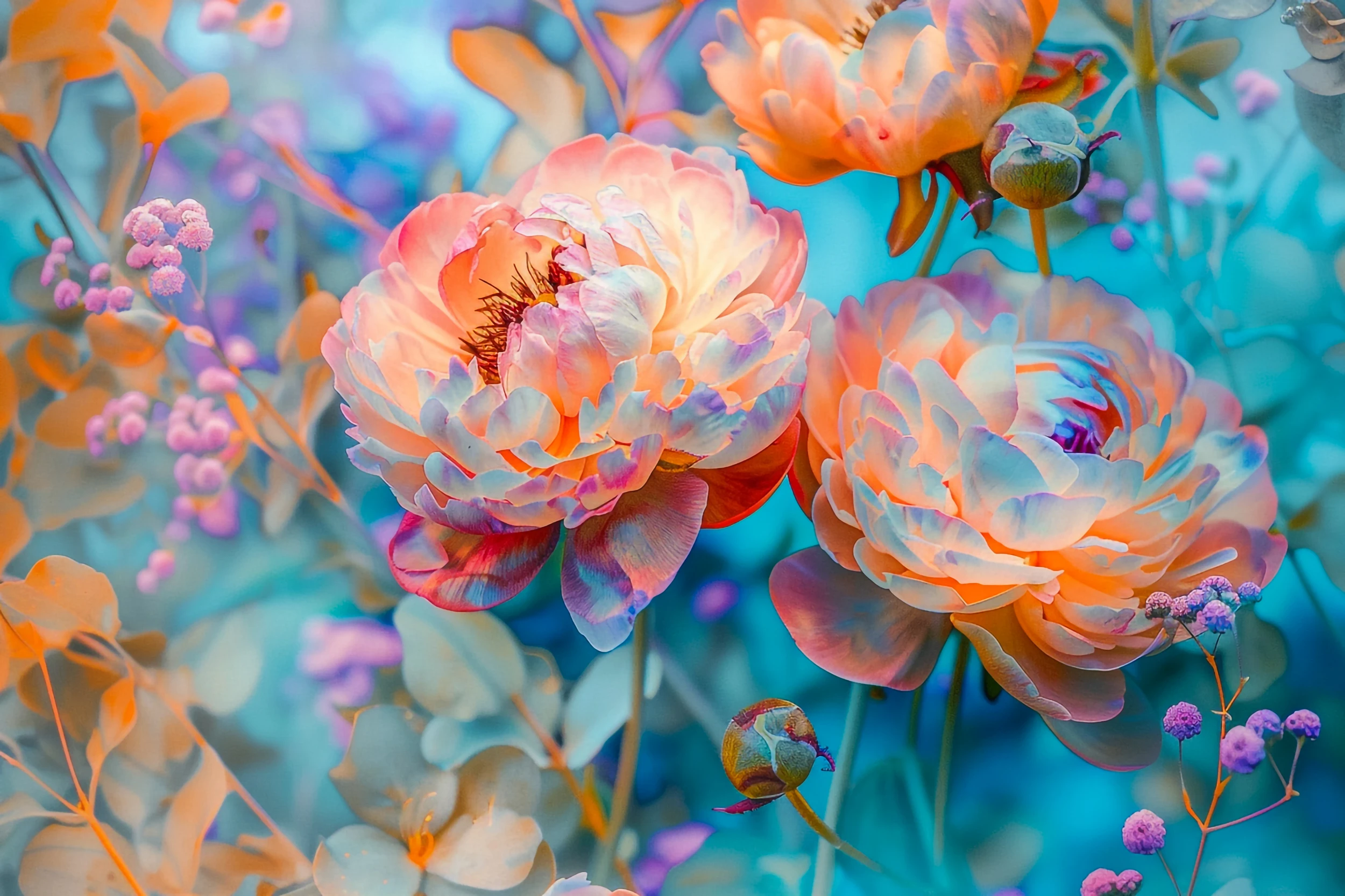 Plongez dans un univers onirique où les pivoines se parent de teintes surréalistes, créant une symphonie visuelle entre rêve et réalité.