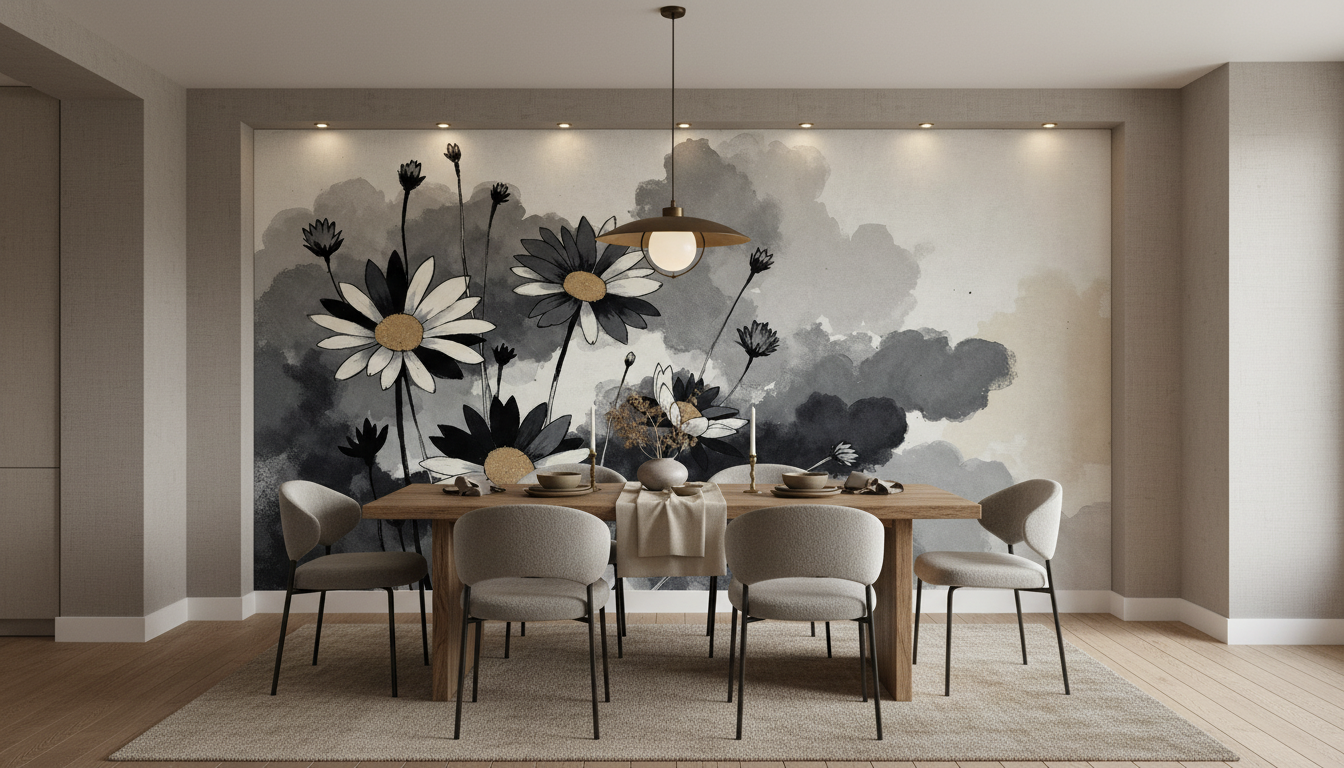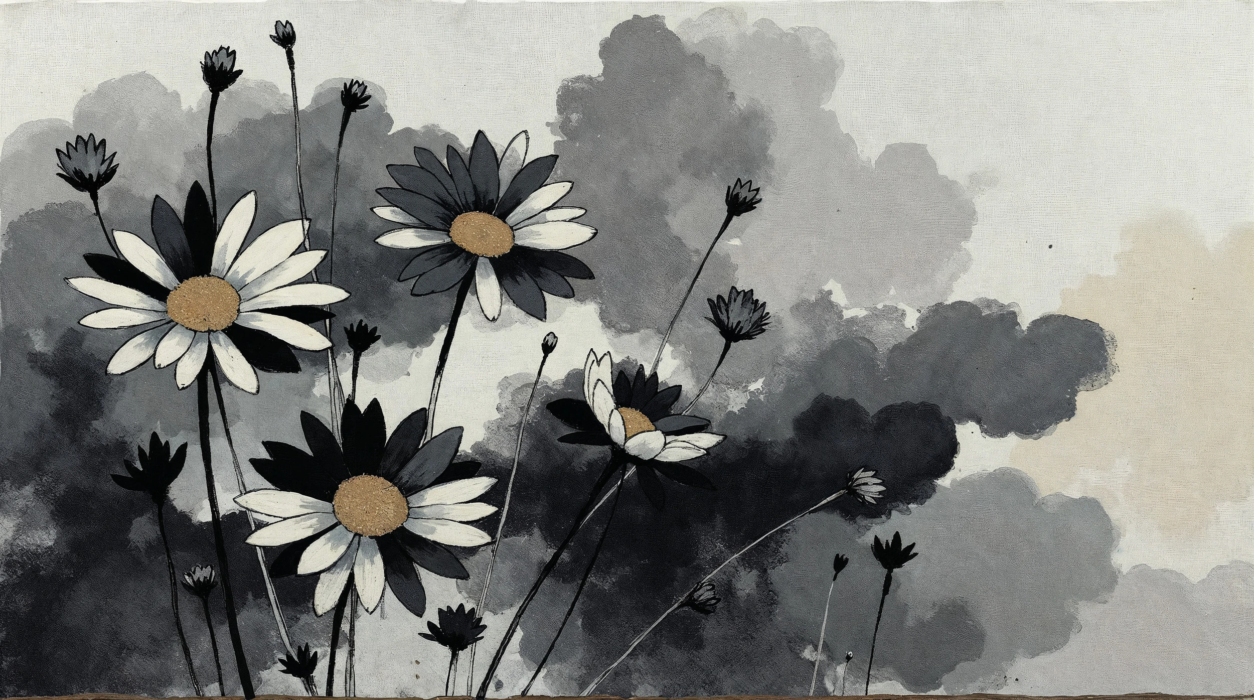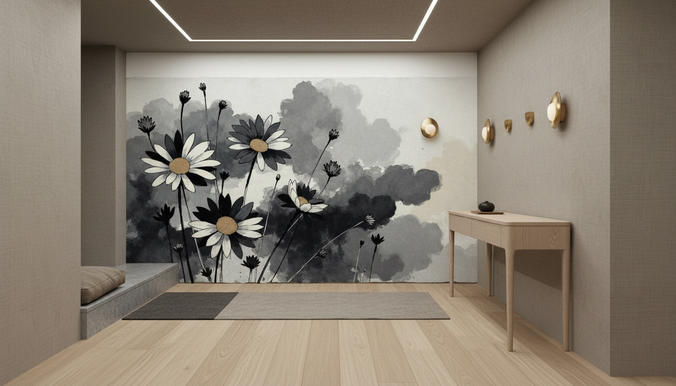 Comme suspendu dans un souffle d’éternité, ce papier peint fleuri capture la délicate mélancolie d’un jardin d’été figé dans le temps, où les marguerites dansent dans une brume poétique entre noir et blanc.