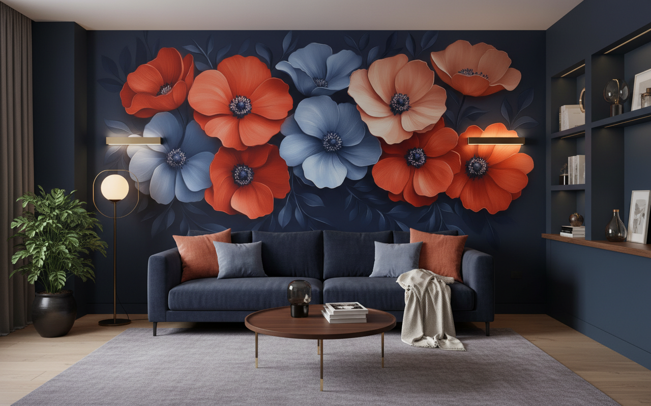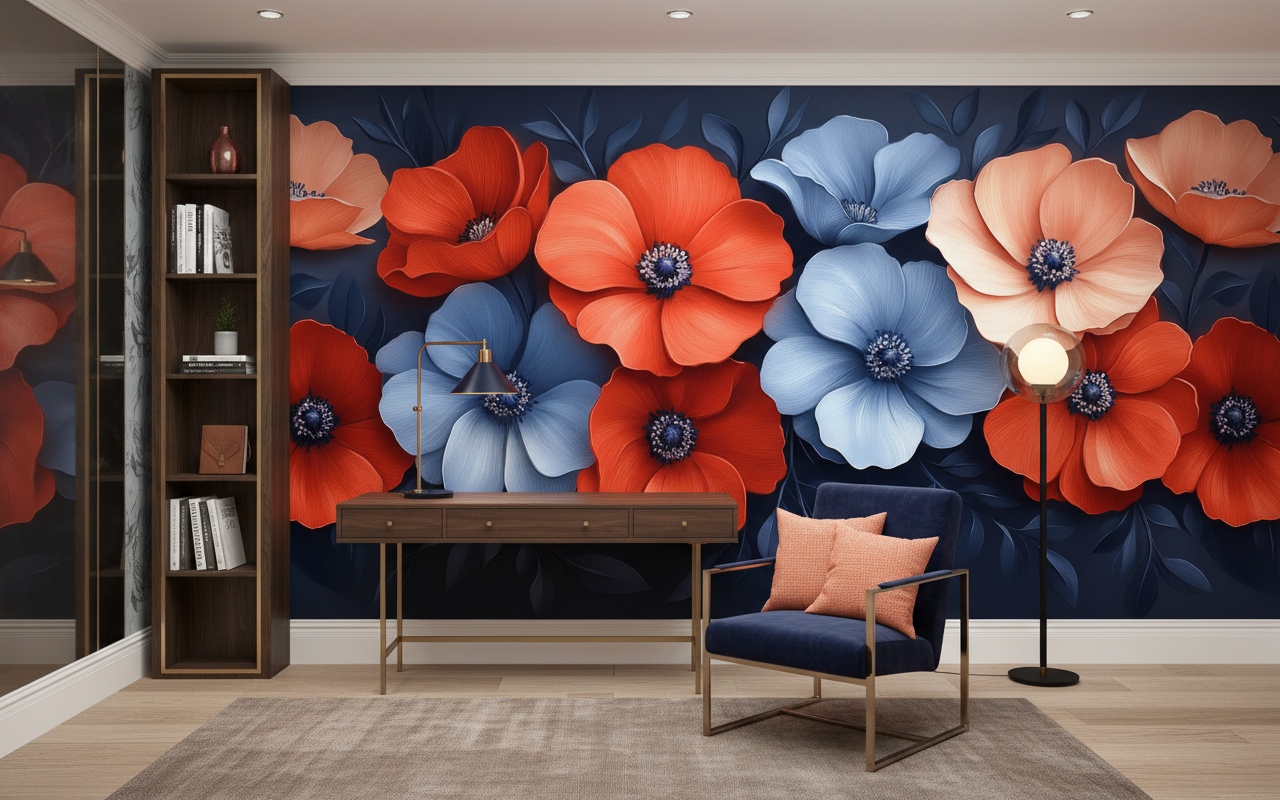 Ce papier peint floral dévoile un bouquet généreux d’anémones stylisées aux pétales délicatement texturés, oscillant entre rouge corail vibrant, bleu azur profond et rose poudré délicat. Chaque fleur décorative s’épanouit avec une grâce naturelle, révélant un cœur aux étamines finement détaillées dans des tons bleu nuit. Le feuillage stylisé d’un bleu marine profond crée un contraste saisissant, apportant une dimension graphique moderne à cette composition florale. Le style artistique rappelle la peinture contemporaine, mêlant réalisme botanique et interprétation décorative raffinée.