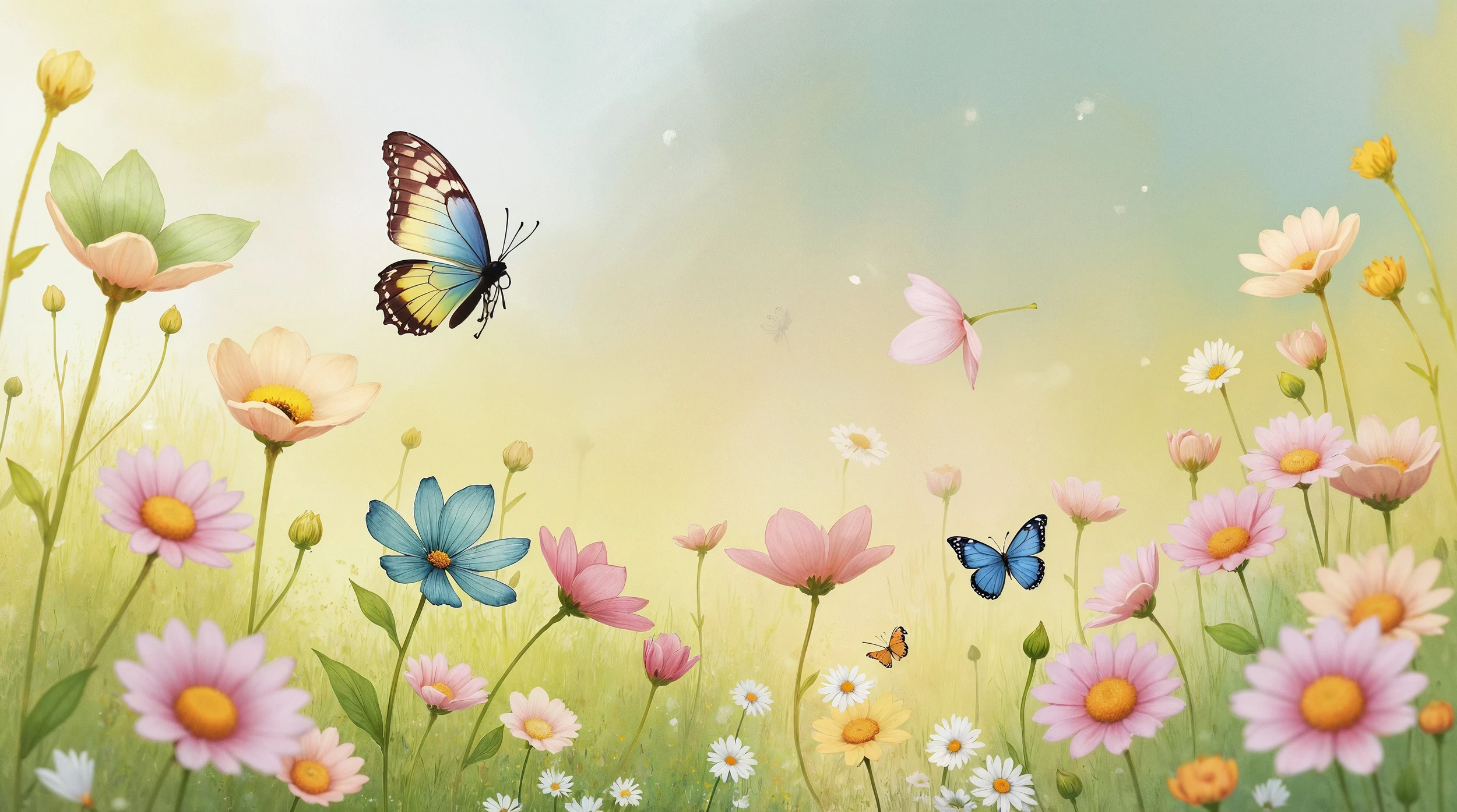 Ce papier peint floral d’exception révèle un univers poétique où s’épanouissent de délicates fleurs des champs aux teintes poudrées. Des cosmos roses, des marguerites blanches et des fleurs aux nuances pêche et lavande s’élèvent gracieusement sur leurs tiges élancées, créant un mouvement naturel et aérien. Quelques fleurs bleues apportent une note de fraîcheur contrastée, tandis que de majestueux papillons colorés – l’un aux ailes dégradées de jaune et bleu, l’autre d’un bleu profond – virevoltent dans cette prairie enchantée.