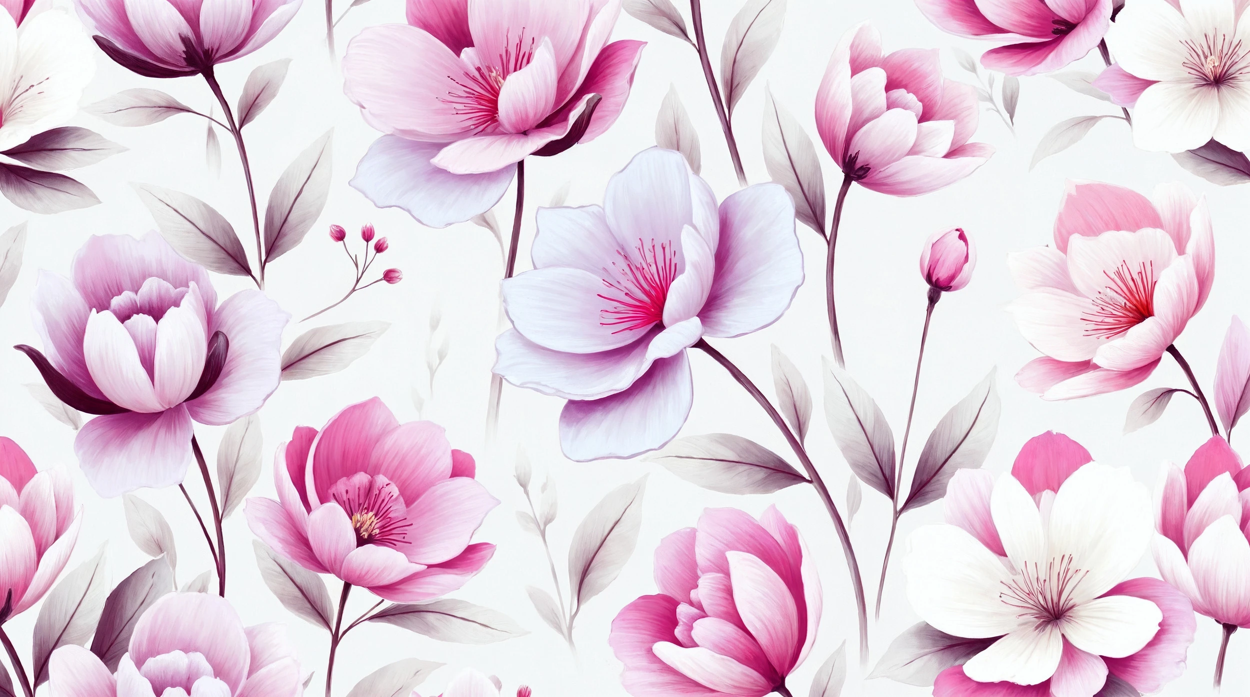 Ce papier peint à motifs floraux dévoile une composition artistique d’une rare élégance, où des fleurs de magnolia aux pétales soyeux dansent gracieusement sur un fond immaculé. Chaque fleur rose et blanche révèle des détails d’un réalisme saisissant : des étamines délicatement rosées, des pétales aux contours veloutés et des feuillages subtils aux nuances gris-mauve. Le style graphique s’inspire de l’aquarelle botanique, offrant cette transparence et cette fluidité propres aux plus belles planches naturalistes. Les tons roses poudrés se marient harmonieusement aux nuances blanches et aux touches de violet tendre, créant une palette chromatique d’une sophistication remarquable.