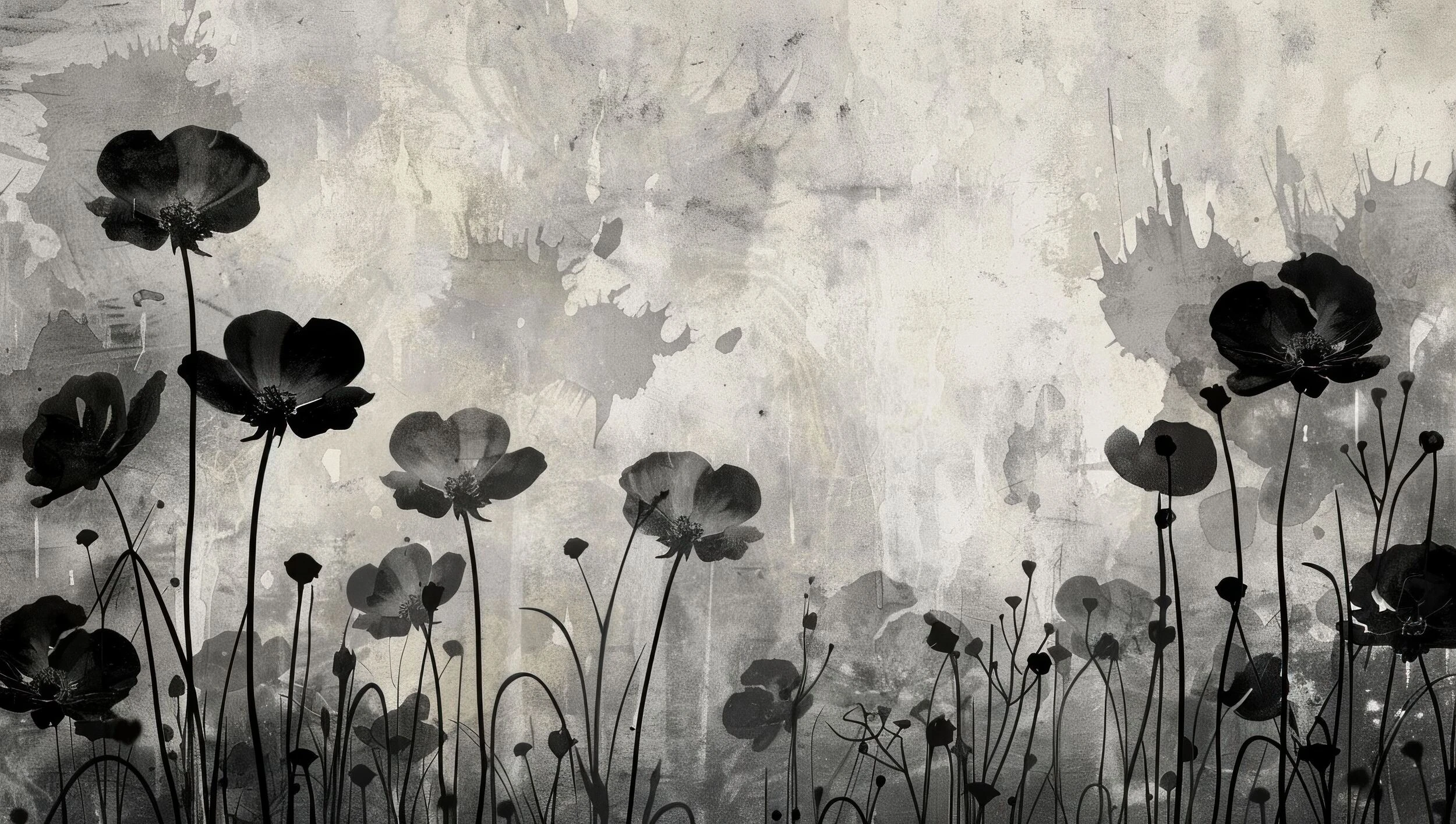 Cette fresque murale artistique révèle une prairie enchantée de coquelicots stylisés aux pétales délicatement ombrés, dansant sur leurs tiges graciles dans un ballet figé. Le style aquarelle moderne confère à chaque fleur une profondeur saisissante, où les nuances de gris anthracite se fondent harmonieusement avec les tons crème et les blancs nacré. L’arrière-plan, subtilement tacheté d’éclaboussures artistiques, évoque la spontanéité créative d’un atelier d’artiste, créant un effet de matière d’une rare sophistication.