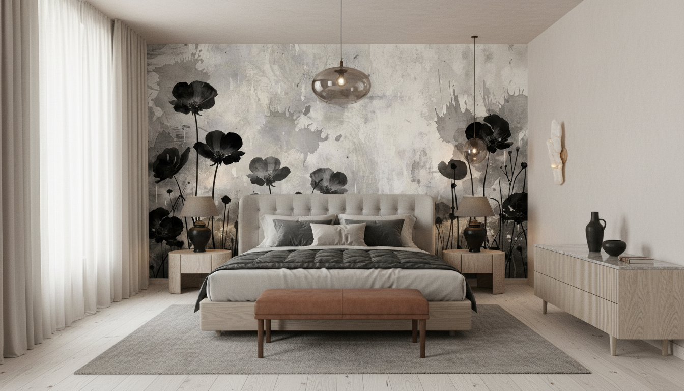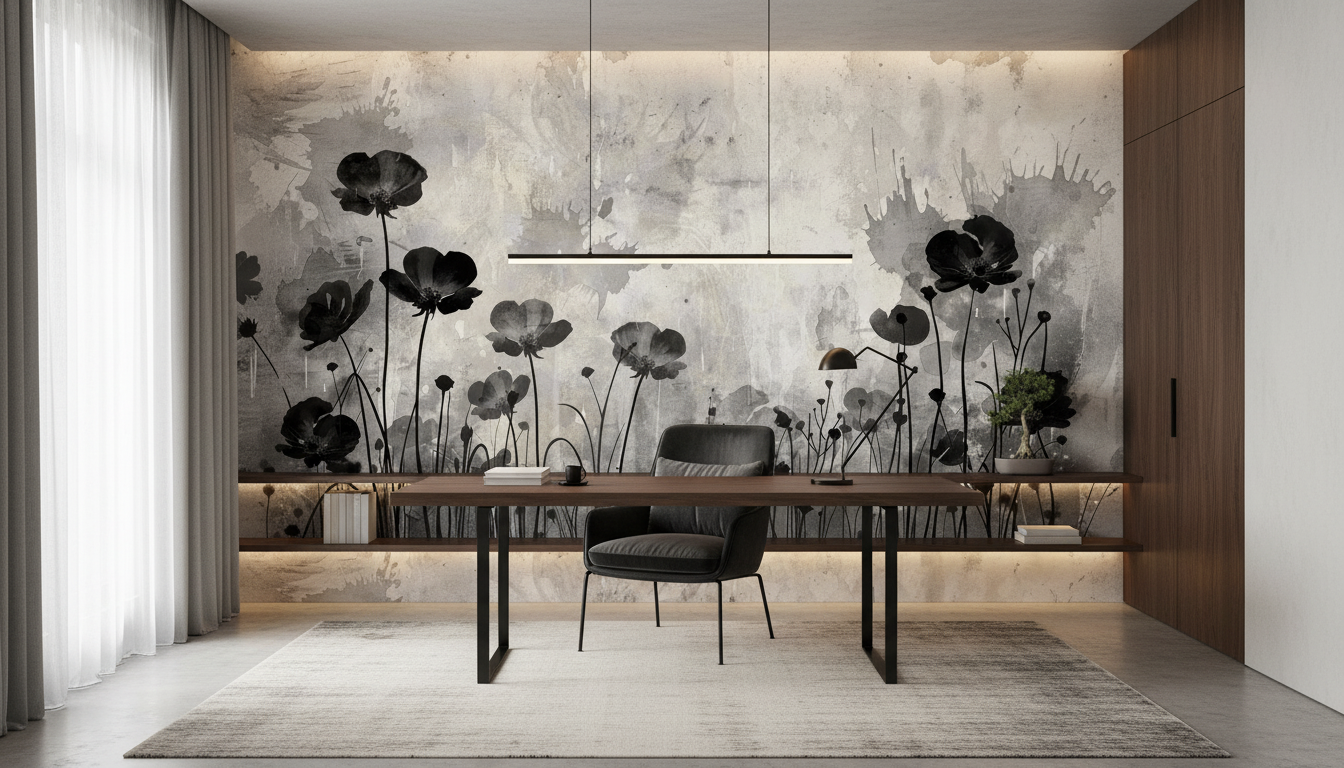 Ce revêtement mural design trouve sa place idéale dans une chambre parentale, où il créera une atmosphère romantique et apaisante propice au repos. Dans un salon contemporain, il apportera une touche de raffinement naturel, particulièrement saisissant sur un mur d’accent derrière un canapé en lin écru ou en velours charbon. Pour un bureau à domicile, cette fresque florale stimulera la créativité tout en préservant une ambiance sereine favorable à la concentration.