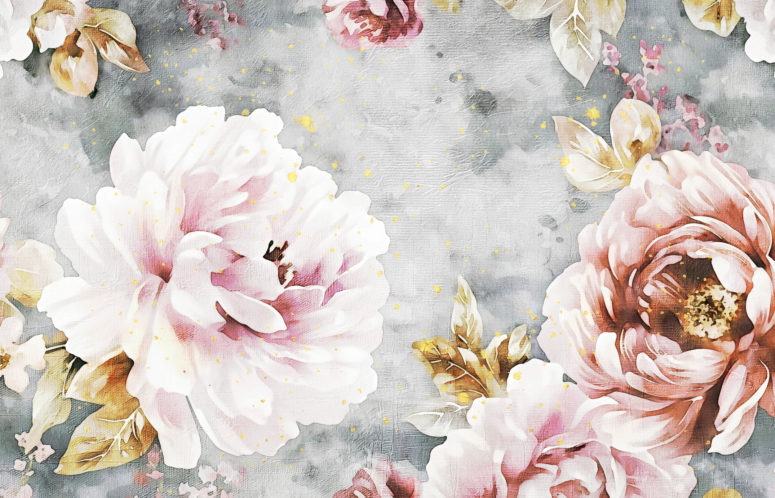 Cette œuvre murale dévoile une composition florale d’une délicatesse exceptionnelle, où de majestueuses pivoines blanches et roses s’épanouissent avec une grâce naturelle saisissante. Les fleurs aquarellées aux pétales généreusement ourlés révèlent leurs cœurs tendres dans une symphonie de nuances poudrées, tandis que des feuillages dorés aux reflets mordorés viennent sublimer l’ensemble. Le style aquarelle confère à chaque élément une transparence et une fluidité remarquables, créant des effets de matière d’une beauté saisissante.