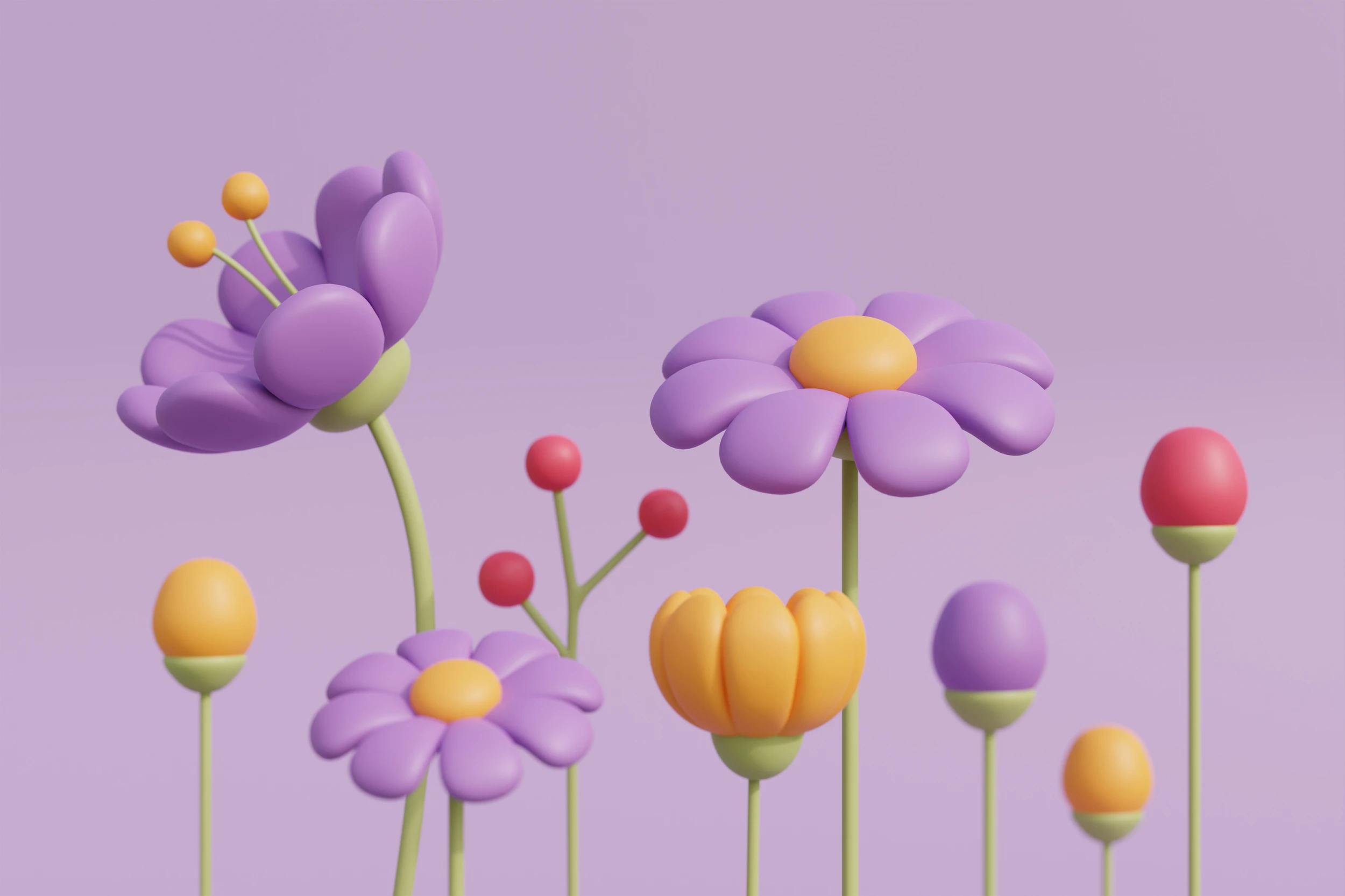 Ce papier peint aux motifs floraux stylisés dévoile un univers graphique tendre et moderne, où s’épanouissent des fleurs 3D aux formes arrondies dans un style résolument contemporain. Les marguerites violettes aux pétales voluptueux côtoient d’élégantes fleurs tubulaires orangées, créant une composition harmonieuse et équilibrée. Des boutons floraux colorés ponctuent délicatement cette prairie stylisée, tandis que de fines tiges vert tendre viennent structurer l’ensemble avec une grâce naturelle.