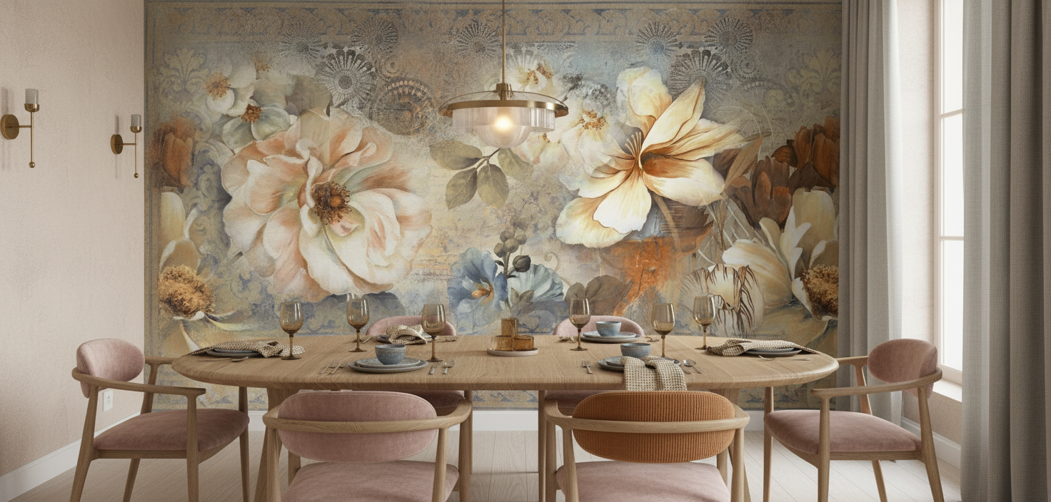 Cette fresque florale s’épanouit particulièrement bien en tête de lit ou sur un pan de mur d’accent, créant un point focal d’une élégance remarquable. Pour une décoration harmonieuse, privilégiez des couleurs complémentaires comme le vert sauge, le rose poudré ou le blanc cassé, qui sublimeront la richesse de cette composition botanique.