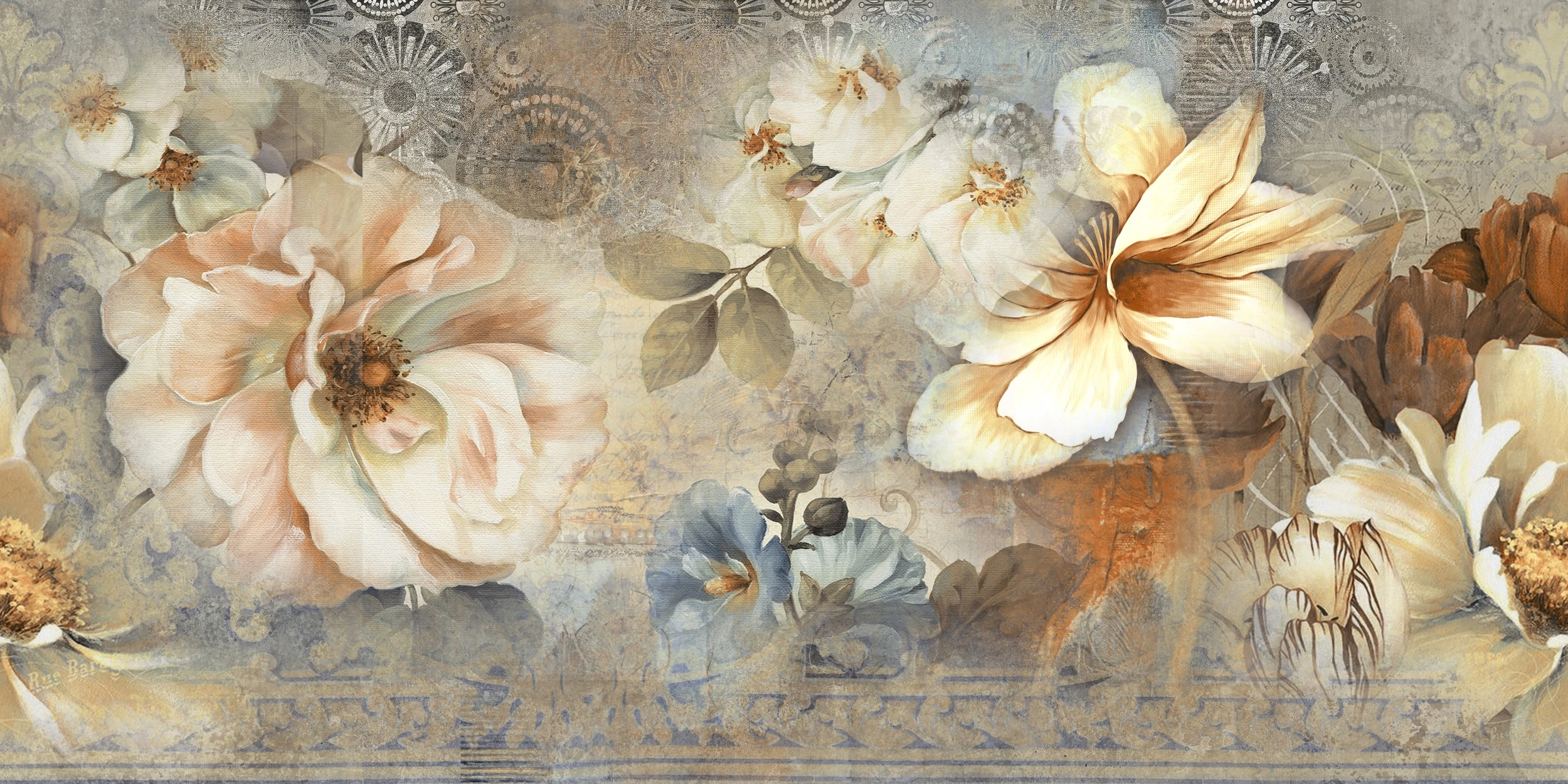 Ce papier peint floral vintage dévoile une composition d’une richesse exceptionnelle, orchestrée autour de roses majestueuses aux tons poudrés et de fleurs exotiques aux pétales généreux. Les pivoines délicates côtoient des hibiscus éclatants, tandis que des motifs ornementaux finement ciselés créent une trame décorative d’inspiration orientale. La technique picturale évoque l’art de l’aquarelle romantique, avec des effets de transparence et des fondus subtils qui donnent vie à chaque élément.
