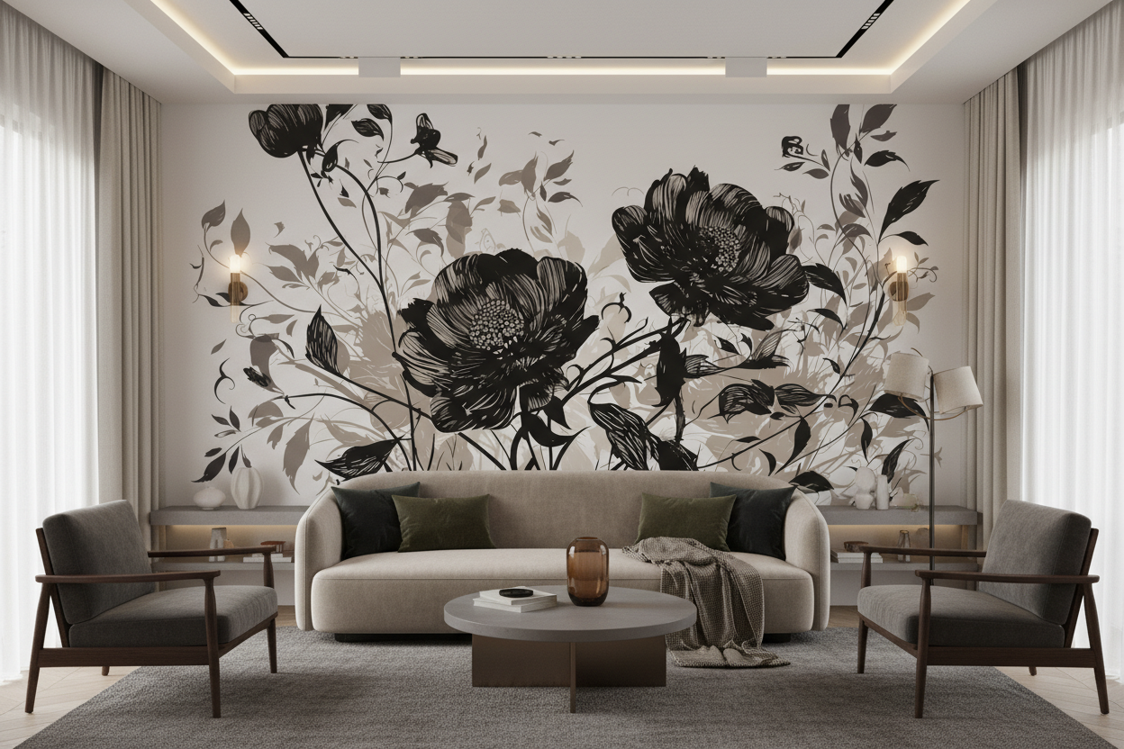 Élégant papier peint floral sur mesure. Pivoines noir et beige, design vintage raffiné. Créez une ambiance romantique et sophistiquée.