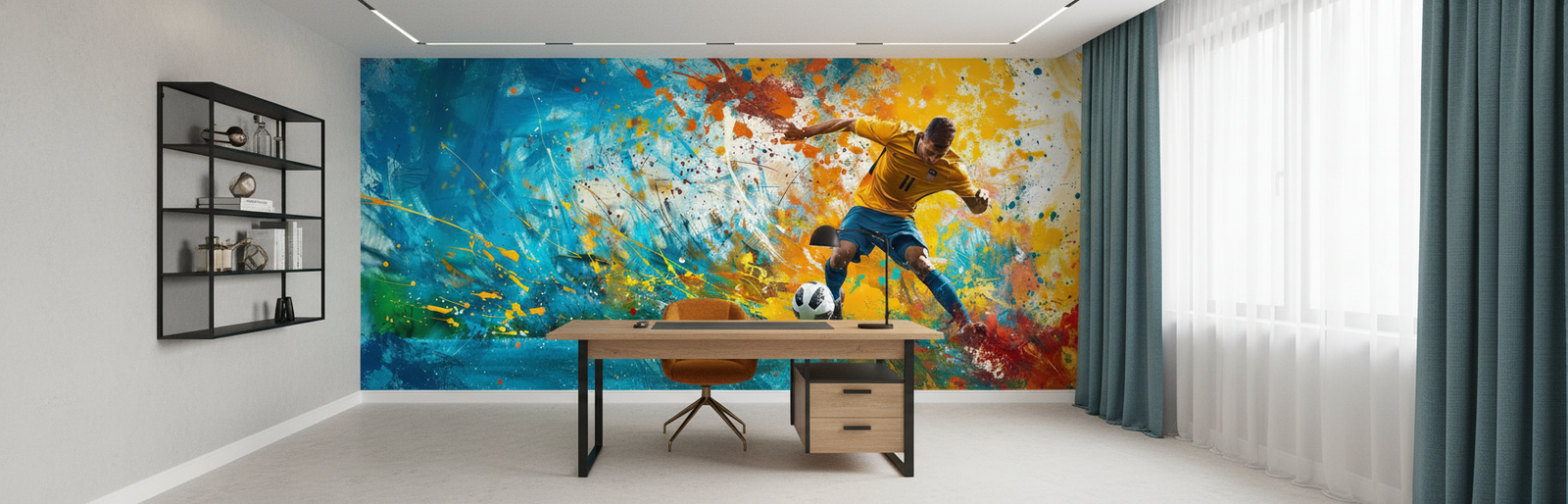 Plongez dans l’énergie du sport avec ce papier peint football artistique. Une explosion de couleurs vives pour une déco murale dynamique et moderne. Idéal pour chambre ado, bureau créatif ou salon contemporain. Créez votre ambiance unique et sur mesure avec Auramur.
