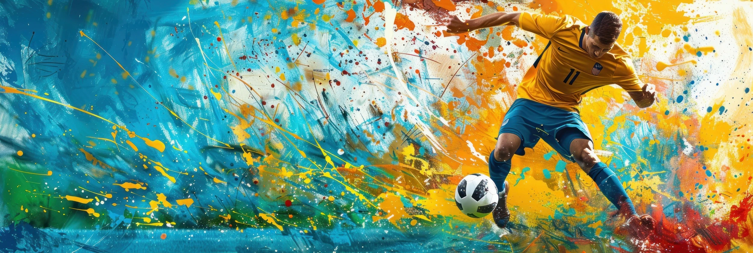 Cette fresque murale sportive capture l’essence même du beau jeu à travers un style pictural expressionniste saisissant. Au cœur de la composition, un joueur en maillot jaune et short bleu s’élance dans un geste technique parfait, le ballon à ses pieds tel un danseur maîtrisant son art. La silhouette athlétique se détache majestueusement sur un fond explosif de couleurs vives : des bleus profonds comme l’océan se mêlent harmonieusement à des oranges flamboyants et des jaunes éclatants, créant une symphonie chromatique d’une intensité rare. Les éclaboussures de peinture et projections colorées évoquent la technique du dripping, rappelant les plus grands maîtres de l’art contemporain.