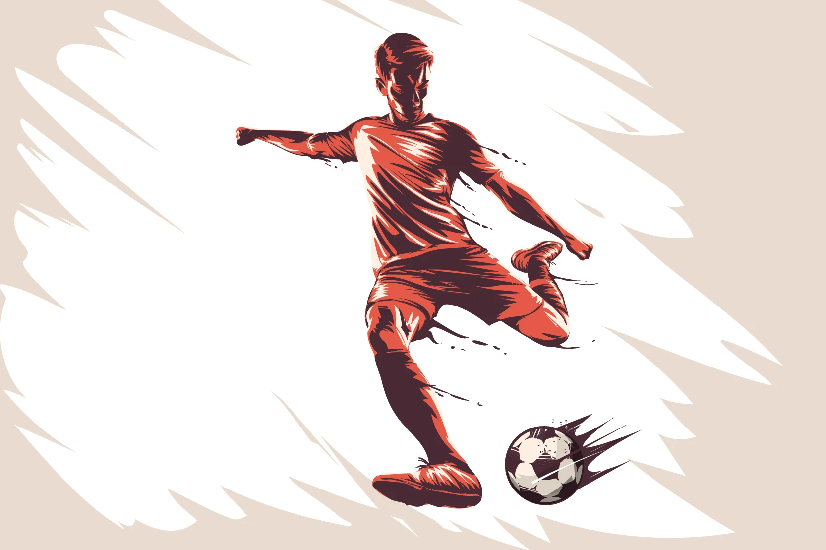 Ce papier peint sport capture l’essence même du beau jeu à travers une illustration dynamique d’un footballeur en action. Le personnage, saisi dans un élan de puissance absolue, s’apprête à frapper le ballon avec une détermination palpable. Réalisée dans un style graphique moderne, cette œuvre joue magistralement sur les contrastes entre les tons chauds rouge-orangé et les nuances beiges délicates de l’arrière-plan. Les lignes de mouvement, tracées avec une précision artistique remarquable, amplifient la sensation de vitesse et confèrent à l’ensemble une esthétique contemporaine particulièrement saisissante.