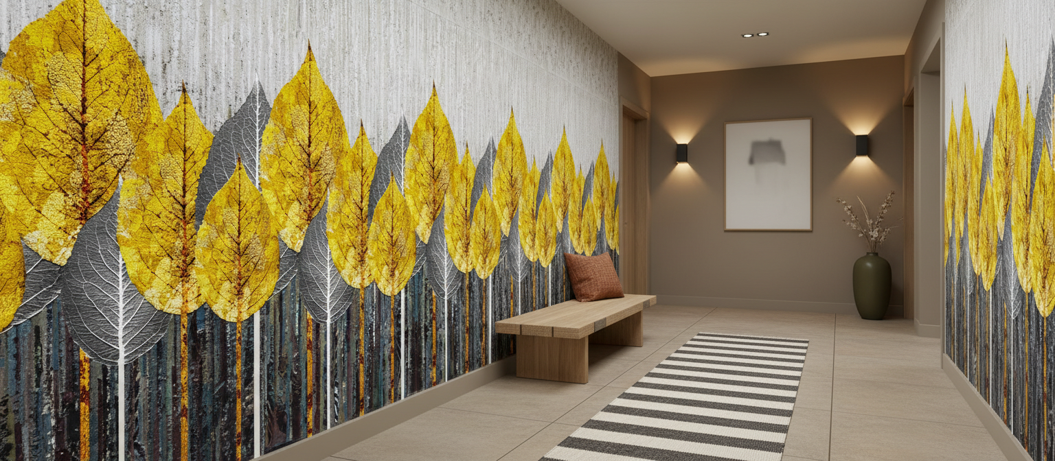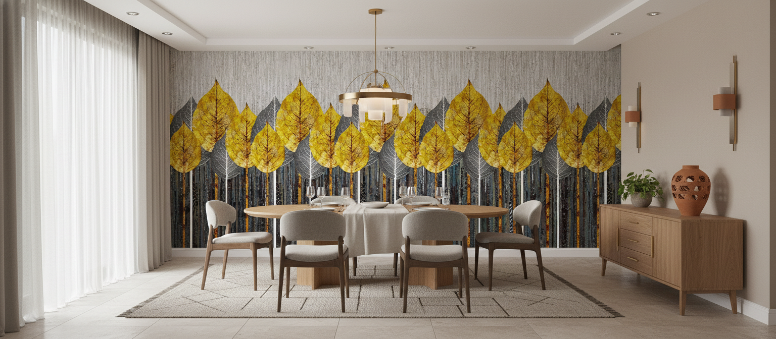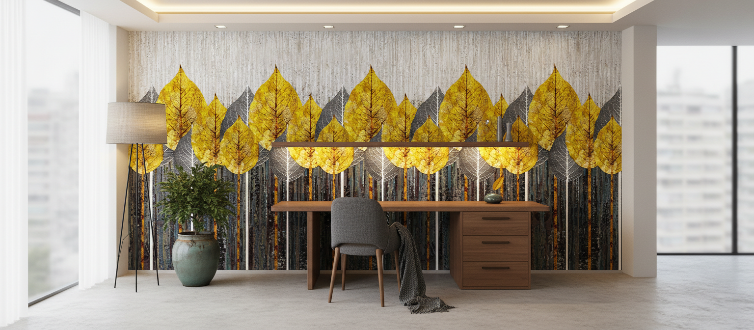 Ce revêtement mural artistique s’inscrit parfaitement dans les tendances déco actuelles privilégiant le retour à la nature et les motifs botaniques stylisés. Que vous adoptiez un style scandinave épuré, bohème chic ou moderne nature, cette décoration murale forestière s’adapte avec une remarquable polyvalence. L’alternance rythmée des arbres dorés crée un effet de profondeur qui agrandit visuellement l’espace tout en lui conférant un caractère unique.