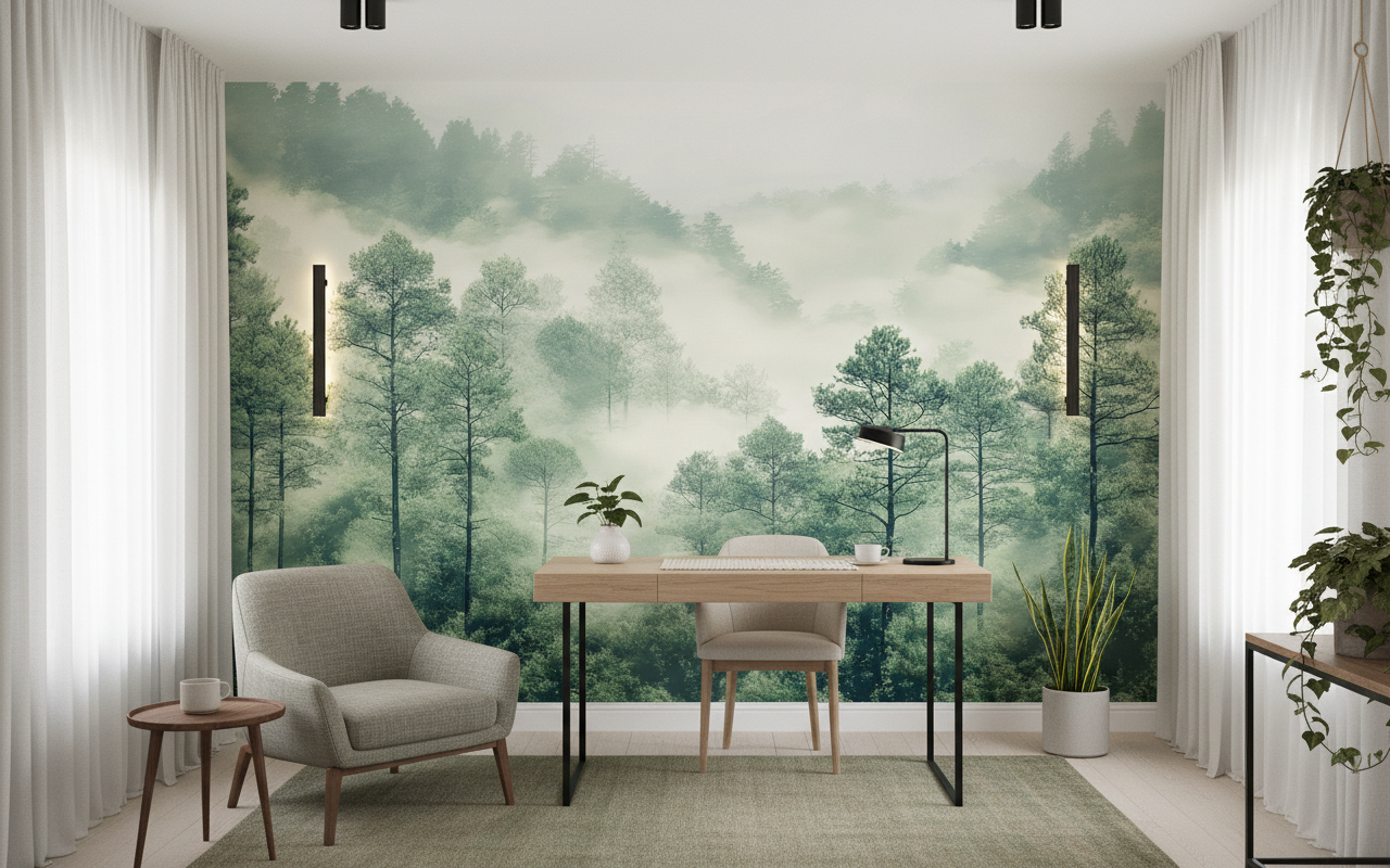 Idéal pour métamorphoser une chambre parentale en cocon de détente, ce papier peint panoramique trouve également sa place dans un salon contemporain où il apportera une touche de nature sophistiquée. Dans un bureau à domicile, il favorisera concentration et créativité grâce à son effet relaxant. Associez-le à du mobilier en bois naturel – chêne clair ou noyer – pour créer une harmonie parfaite avec l’esprit forestier. Les matières naturelles comme le lin écru, la laine bouclée ou le rotin sublimeront cette ambiance organique. Complétez avec des luminaires en laiton brossé et quelques plantes vertes pour prolonger cette invitation à l’évasion sylvestre.