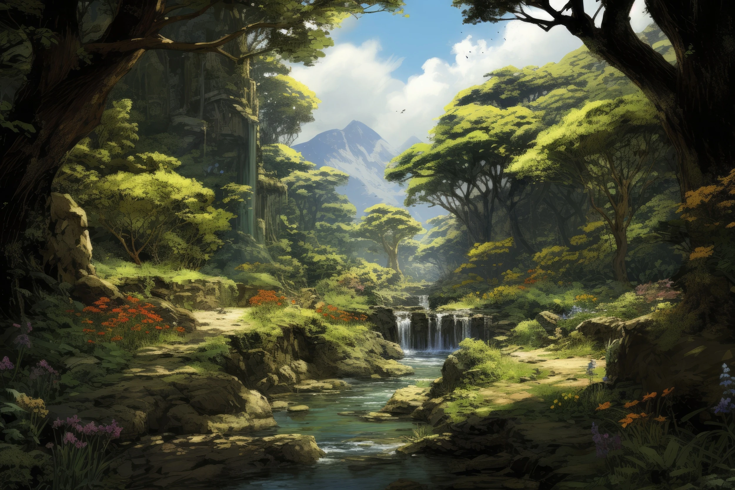 Ce papier peint paysage d’exception dévoile une composition picturale d’une richesse saisissante, évoquant l’art des maîtres paysagistes romantiques. Au cœur de cette scène forestière, une cascade cristalline cascade délicatement entre les rochers moussu, créant un point focal d’une poésie absolue. Les arbres centenaires aux branches généreuses forment une voûte naturelle protectrice, leurs feuillages luxuriants déclinant une palette de verts émeraude et de tons jade subtils.