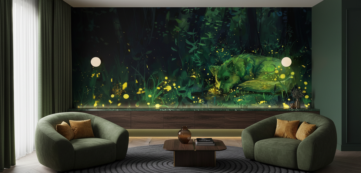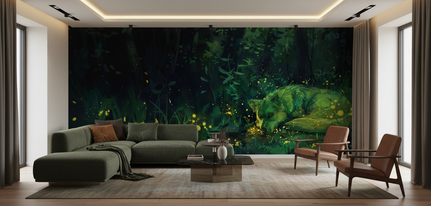 Ce papier peint jungle mystérieuse révèle un univers enchanté où un animal endormi repose paisiblement au cœur d’une végétation luxuriante. L’illustration dévoile un style artistique raffiné, mêlant peinture numérique et touches d’aquarelle pour créer une atmosphère à la fois réaliste et onirique. La silhouette apaisée de l’animal, lovée dans un écrin de feuillages tropicaux, évoque la sérénité d’un refuge naturel préservé.