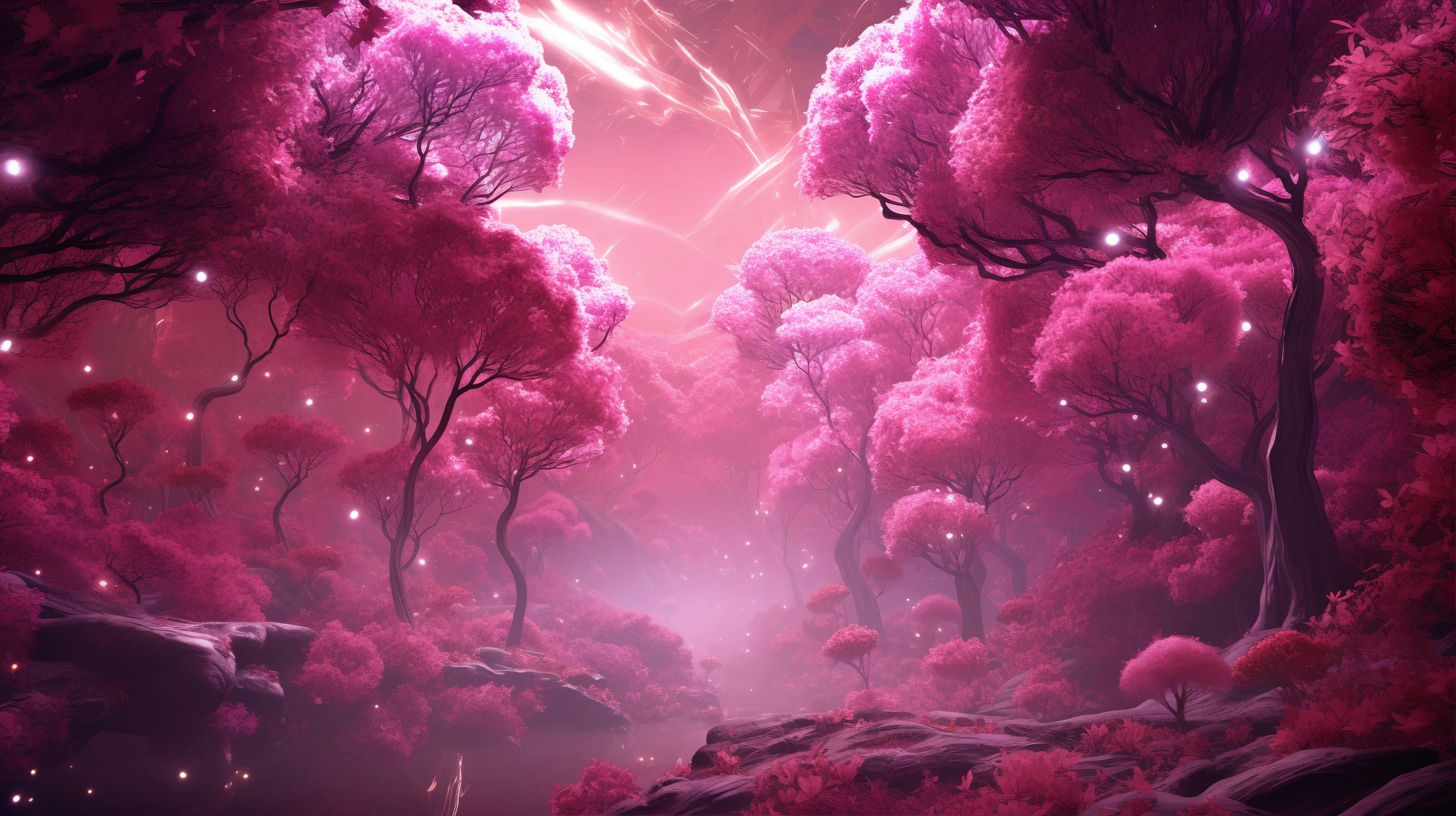 Cette création artistique révèle un paysage forestier mystique d’une beauté saisissante, où des arbres aux silhouettes gracieuses déploient leurs ramures dans un camaïeu de roses magenta et fuchsia. Le style graphique numérique sublime chaque détail avec une précision remarquable : les troncs élancés aux branches tortueuses, le feuillage vaporeux qui évoque des nuages cotonneux, et ces particules lumineuses qui dansent dans l’atmosphère comme une poudre d’étoiles. Les tons roses profonds se marient harmonieusement avec des nuances plus claires, créant une profondeur visuelle captivante. Au premier plan, des rochers et une végétation luxuriante complètent cette composition onirique, tandis que des rayons lumineux percent délicatement la canopée, ajoutant une dimension céleste à l’ensemble.