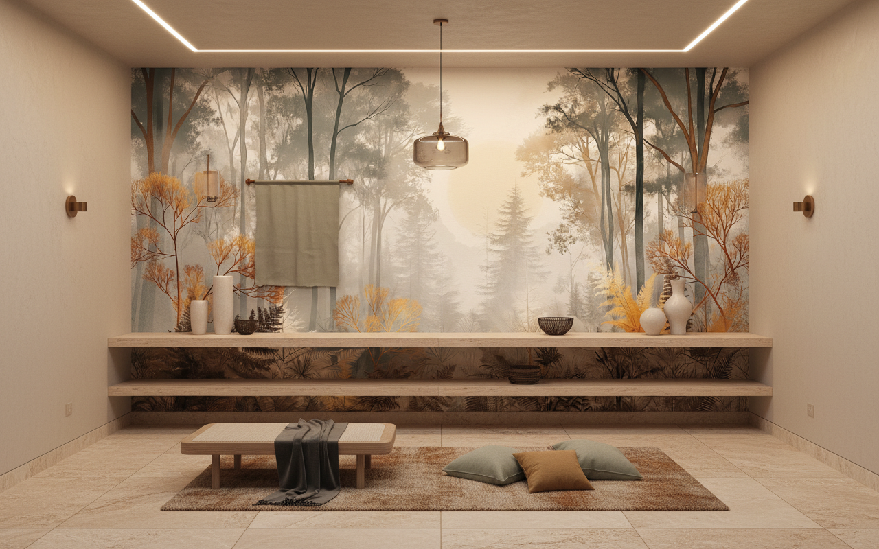 Ce papier peint panoramique forêt trouvera sa place idéale dans un salon moderne en accent wall, apportant une dimension poétique et sophistiquée à votre décoration. Il sublime également une chambre parentale en créant une atmosphère propice à la détente, ou transforme un bureau en véritable refuge inspirant. Pour magnifier son effet, associez-le à du mobilier en bois naturel, des textiles en lin écru ou des accessoires en laiton brossé. Les tons beiges et terra cotta s’harmonisent parfaitement avec ses nuances dorées, tandis que des touches de vert sauge rappelleront subtilement la végétation représentée.