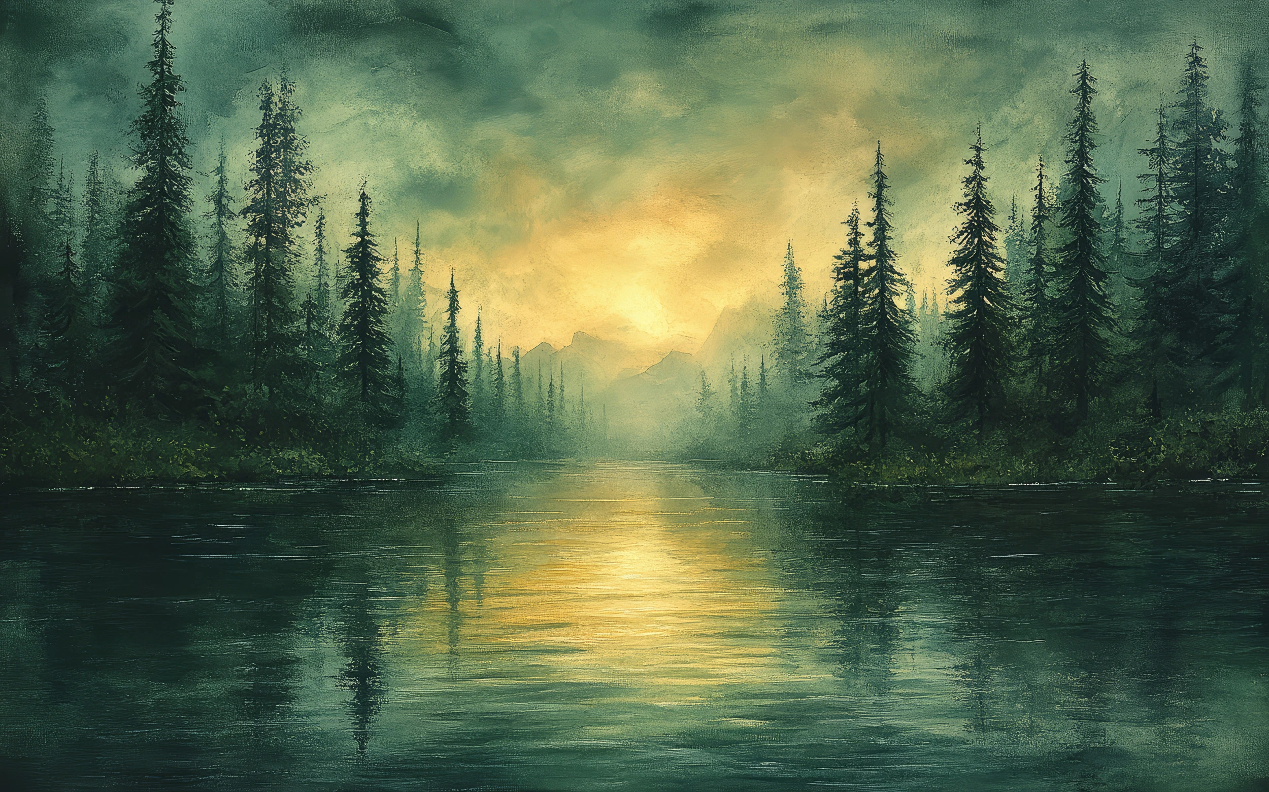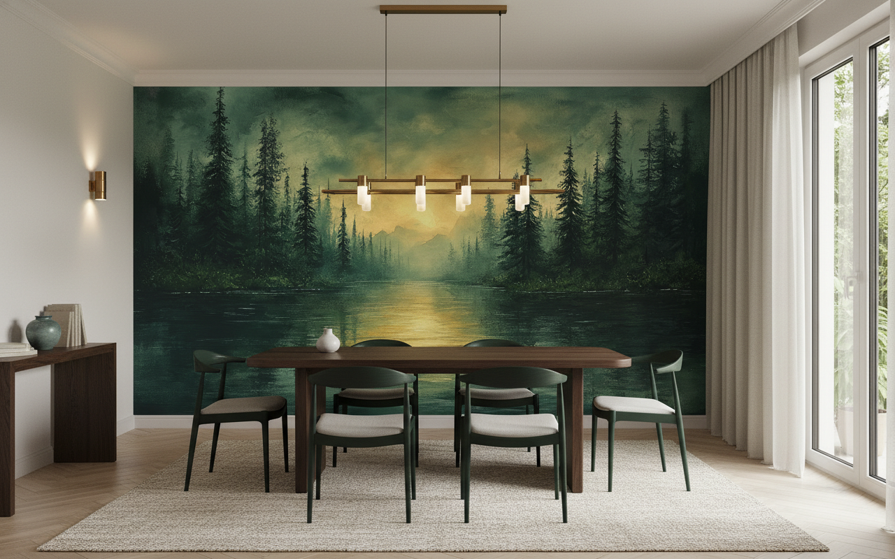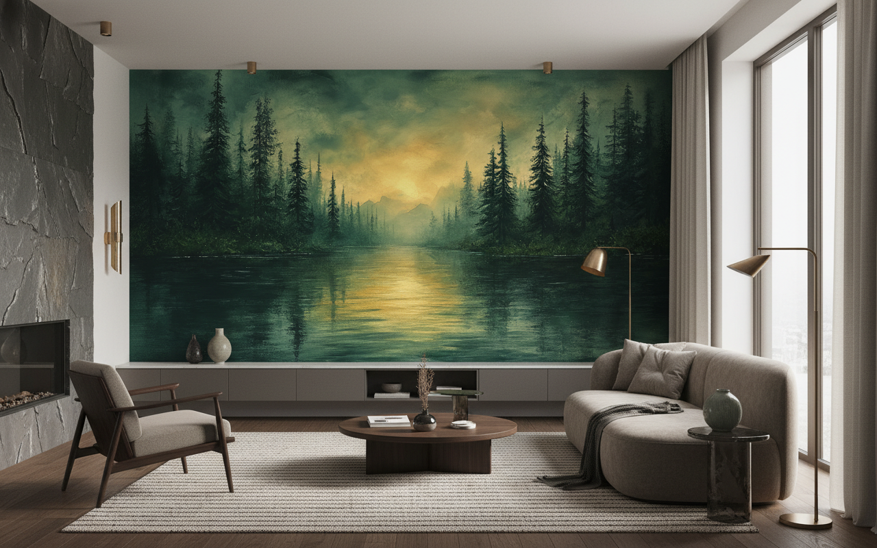 Ce papier peint paysage forestier révèle une composition magistrale mêlant la grandeur des conifères élancés et la sérénité d’un lac miroir aux eaux calmes. Les épicéas et sapins se dressent majestueusement de chaque côté, créant une perspective naturelle vers les montagnes brumeuses qui se dessinent à l’horizon. Le style pictural, d’inspiration romantique et impressionniste, capture avec finesse les jeux de lumière sur l’eau et la végétation. La palette chromatique oscille entre les verts profonds de la forêt dense, les tons dorés du soleil couchant et les nuances émeraude des reflets aquatiques, créant une harmonie colorielle d’une rare sophistication.