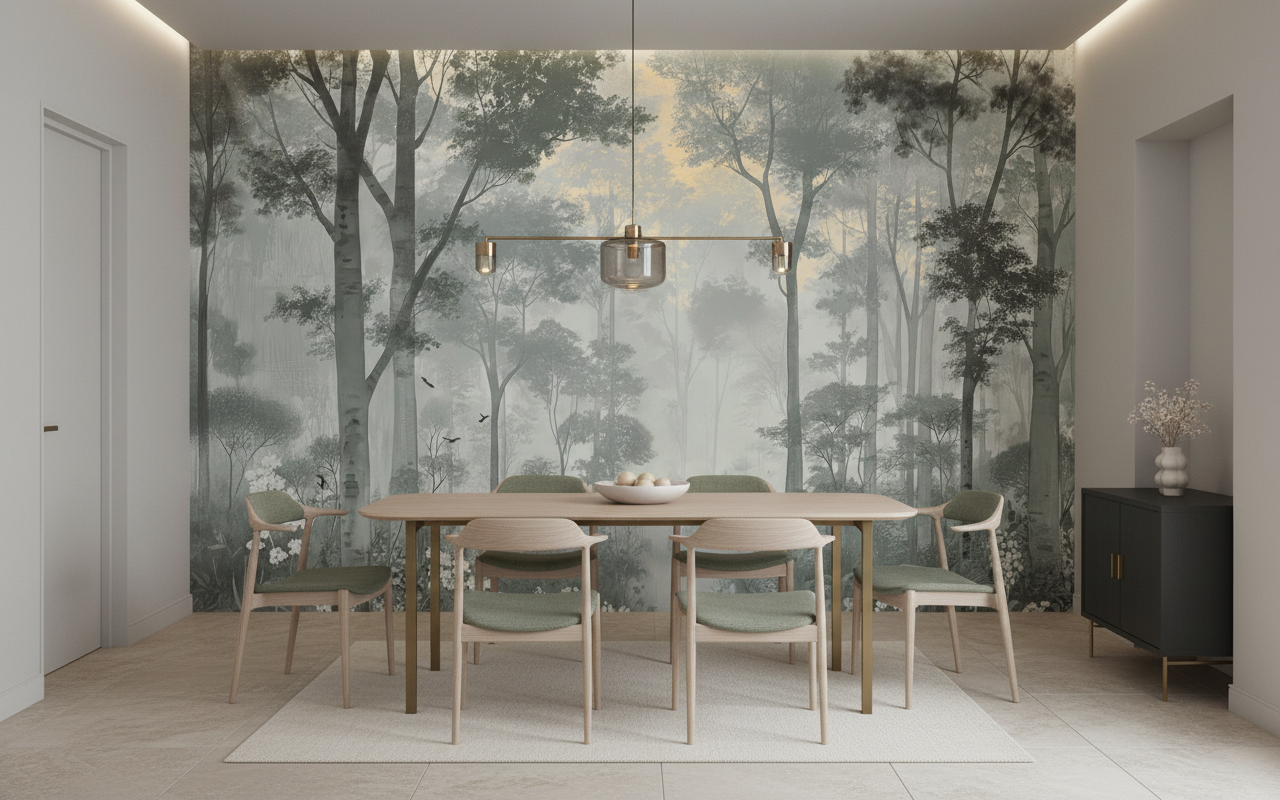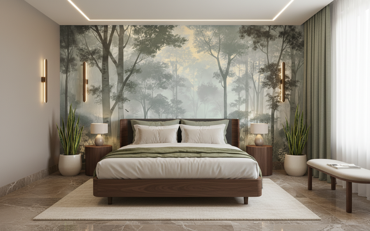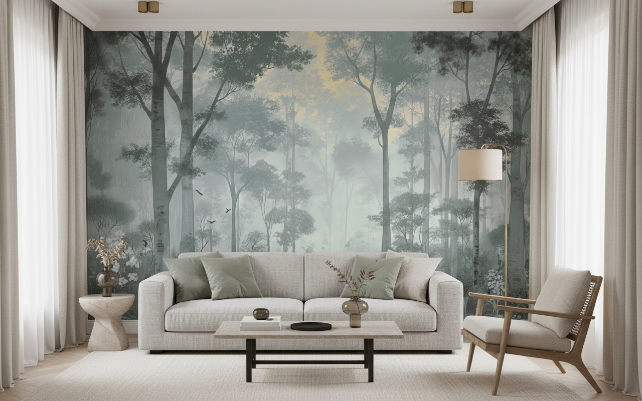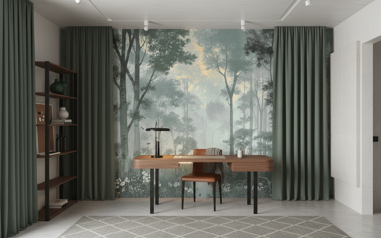 Ce papier peint panoramique nature trouve sa place idéale dans une chambre parentale où il créera une atmosphère propice au repos et à la détente. Dans un salon contemporain, il constituera un magnifique mur d’accent derrière un canapé en lin naturel ou velours vert sauge. Pour un bureau à domicile, cette décoration murale apaisante favorisera la concentration tout en apportant une bouffée d’air frais. Côté associations déco, privilégiez des matières naturelles et authentiques : bois flotté, rotin tressé, pierre brute et textiles en fibres végétales. Des tons neutres comme le blanc cassé, le beige lin ou le vert olive sublimeront cette création tout en préservant son caractère zen et organique.