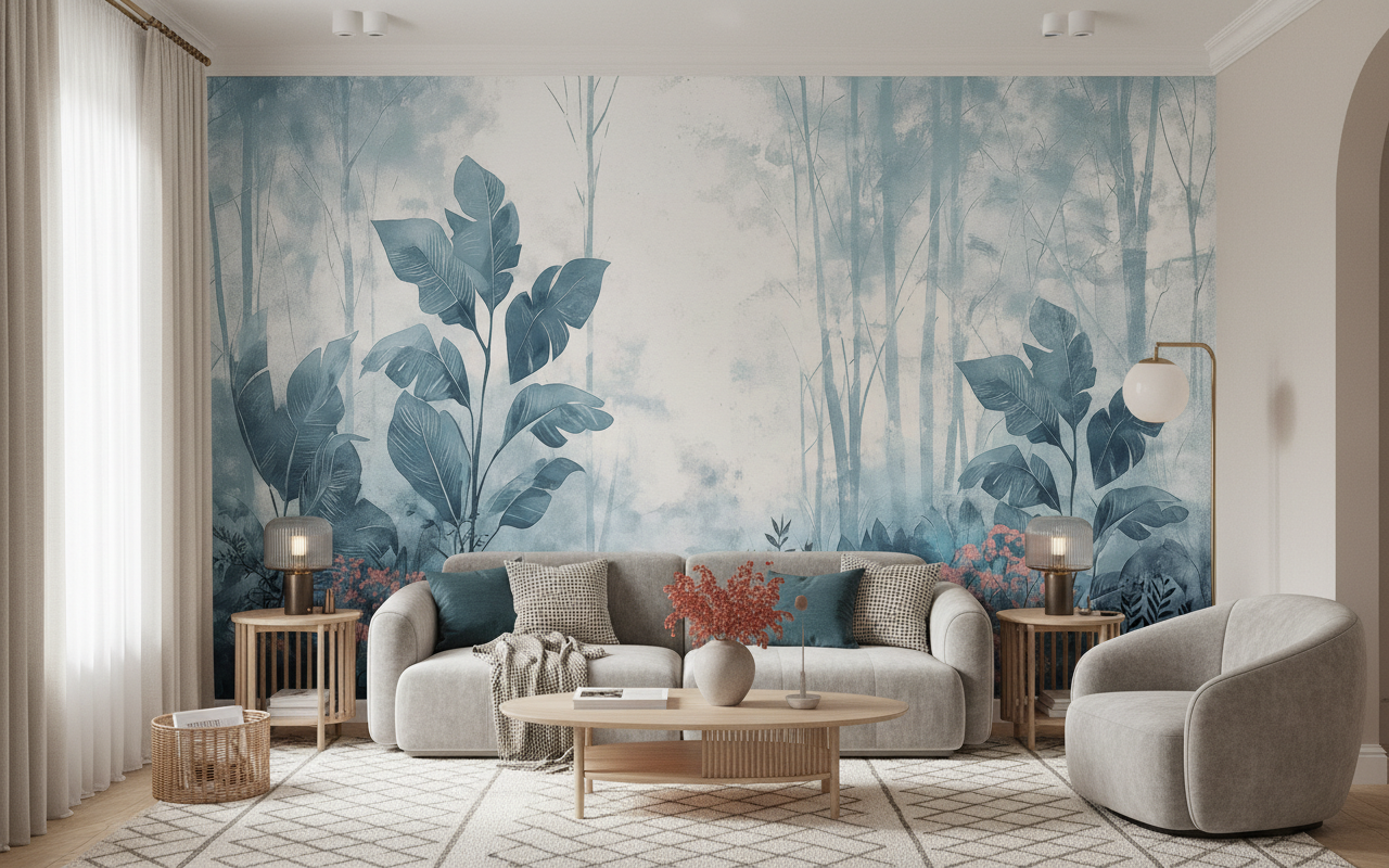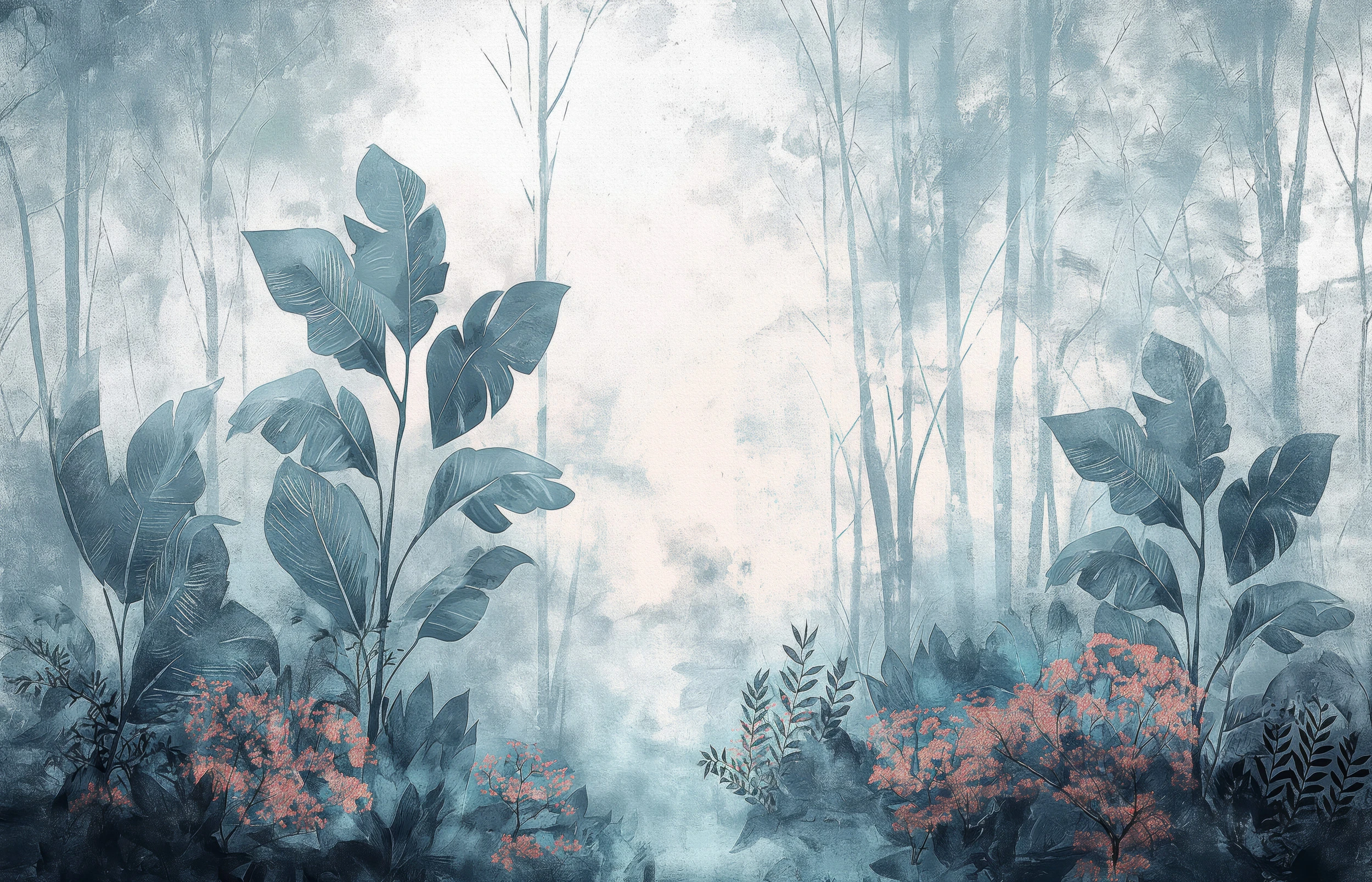 Ce papier peint jungle dévoile une composition végétale d’une richesse exceptionnelle, où se déploient majestueusement des feuilles de bananier aux nervures délicatement dessinées et des plantes tropicales aux formes généreuses. La technique picturale évoque l’aquarelle moderne, mêlant subtilement les tons bleus poudrés et les nuances de gris perle, ponctuées de délicates touches corail qui illuminent la végétation basse. Les arbres élancés se dressent comme des colonnes naturelles dans cette forêt brumeuse, créant une perspective envoûtante qui semble s’étendre à l’infini. Le style graphique allie réalisme botanique et interprétation artistique contemporaine, offrant un rendu d’une sophistication remarquable.