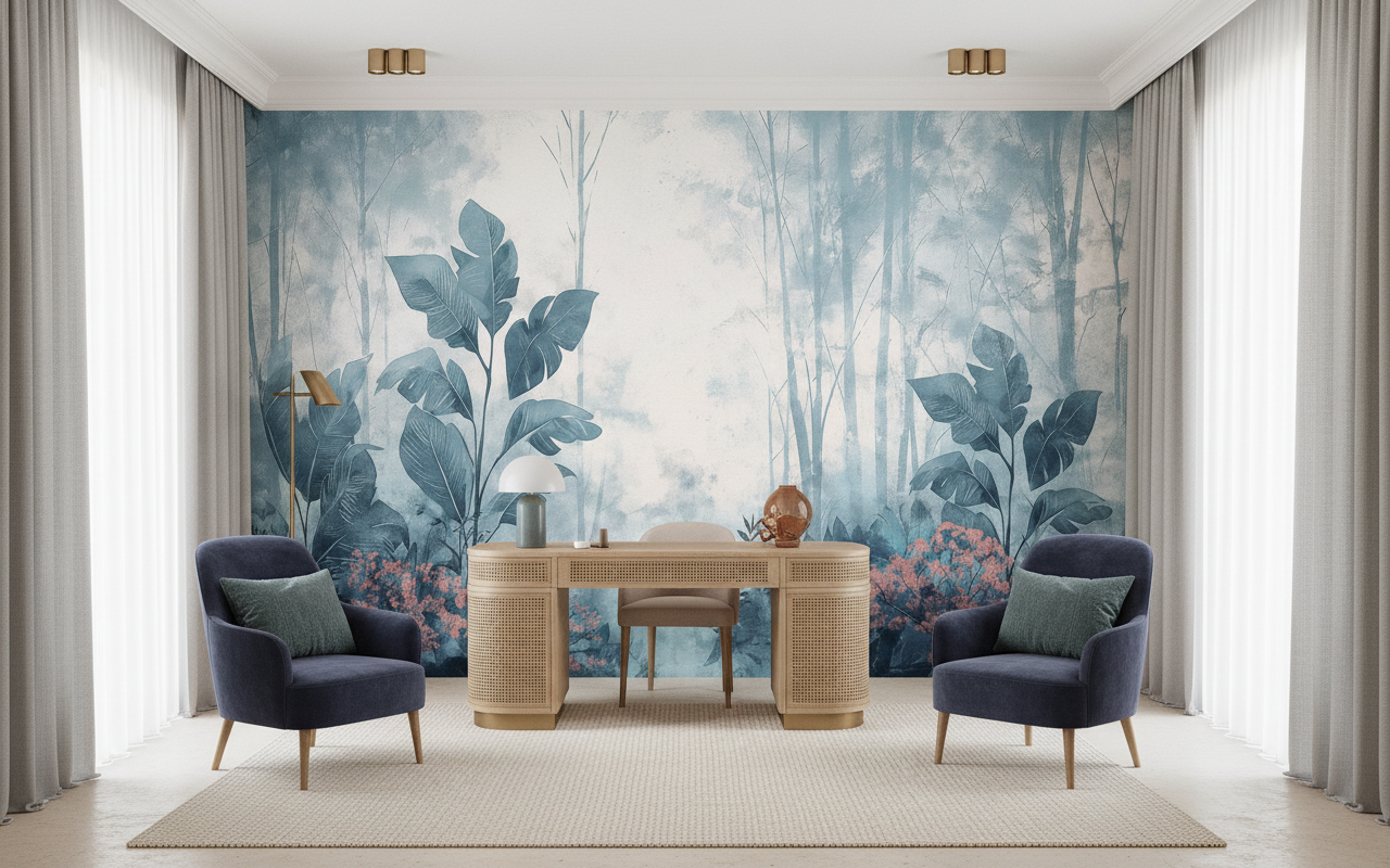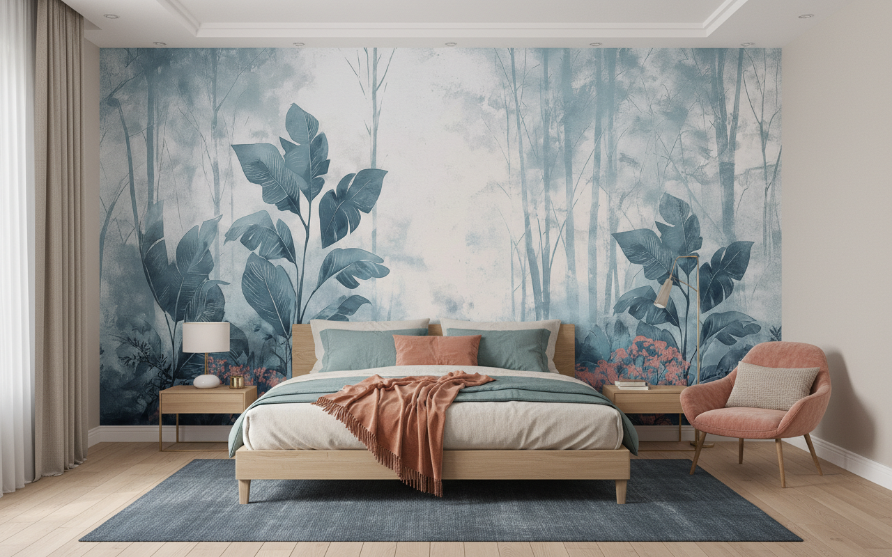 Ce papier peint nature trouve sa place idéale dans un salon moderne où il habillera avec grâce le mur principal, créant un point focal spectaculaire. Dans une chambre parentale, il instaurera une atmosphère cocooning tropicale propice au repos. Pour un bureau zen, cette fresque végétale favorisera la concentration tout en apportant une note d’évasion bienvenue. Associez-le à du mobilier en bois naturel, des textiles en lin écru ou des accessoires en rotin pour sublimer son caractère tropical chic. Les tons neutres comme le blanc cassé, le beige ou le gris clair s’harmoniseront parfaitement avec cette palette végétale.