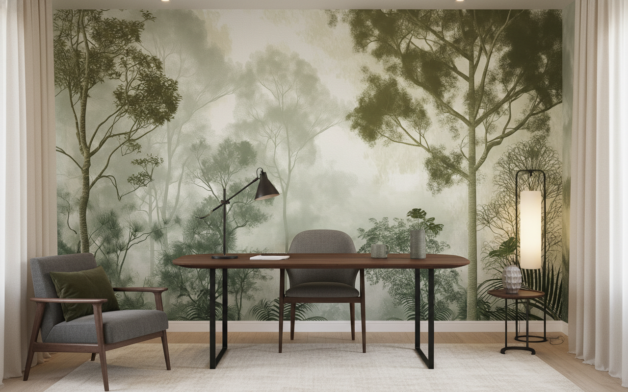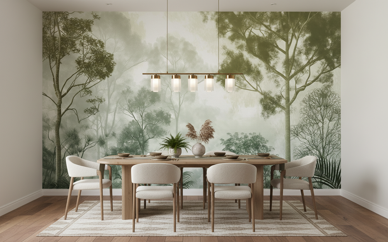 Exécuté dans un style de peinture murale artistique, ce papier peint présente une palette chromatique d’une sophistication rare. Les tons verts subtils se déclinent en nuances délicates, du vert tendre des jeunes pousses au vert profond des frondaisons matures, le tout sublimé par des tonalités beiges et crème qui créent cette atmosphère brumeuse si caractéristique des forêts tropicales au lever du jour. Cette technique picturale rappelle les plus belles fresques botaniques du siècle dernier, conférant à l’ensemble une dimension artistique exceptionnelle.