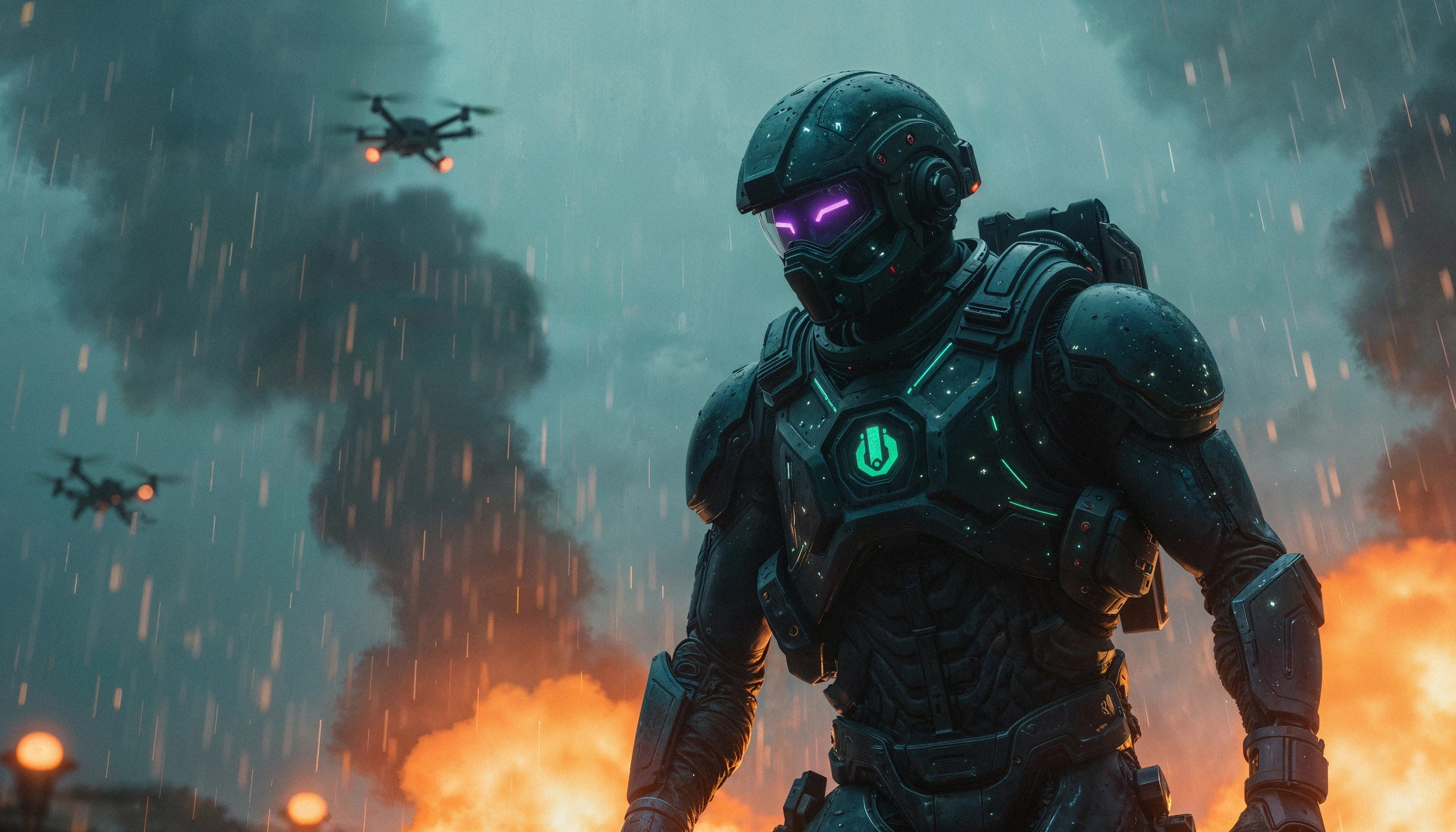 L’arrière-plan dévoile un paysage urbain dystopique noyé dans une brume épaisse, illuminé par des explosions orangées qui créent un contraste saisissant avec les tons bleu-vert dominants. Des drones de surveillance aux yeux rougeoyants patrouillent dans le ciel orageux, ajoutant une dimension cinématographique à cette composition. Le style graphique, d’un réalisme digital poussé, évoque les univers des grands blockbusters de science-fiction et des jeux vidéo dernière génération.