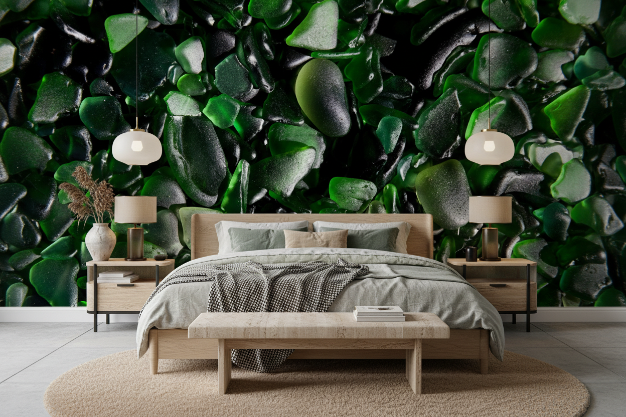 Ce papier peint minéral révèle un kaléidoscope fascinant de galets de verre translucides aux nuances émeraude et jade. Chaque fragment, minutieusement photographié dans un réalisme saisissant, dévoile sa texture lisse et ses reflets cristallins. Les tons verts profonds se déclinent du vert forêt le plus sombre aux nuances menthe les plus délicates, créant une symphonie chromatique d’une richesse exceptionnelle. Cette photographie haute définition capture avec une précision remarquable la transparence du verre marin, ses arêtes arrondies par l’érosion naturelle et ses jeux de lumière subtils.