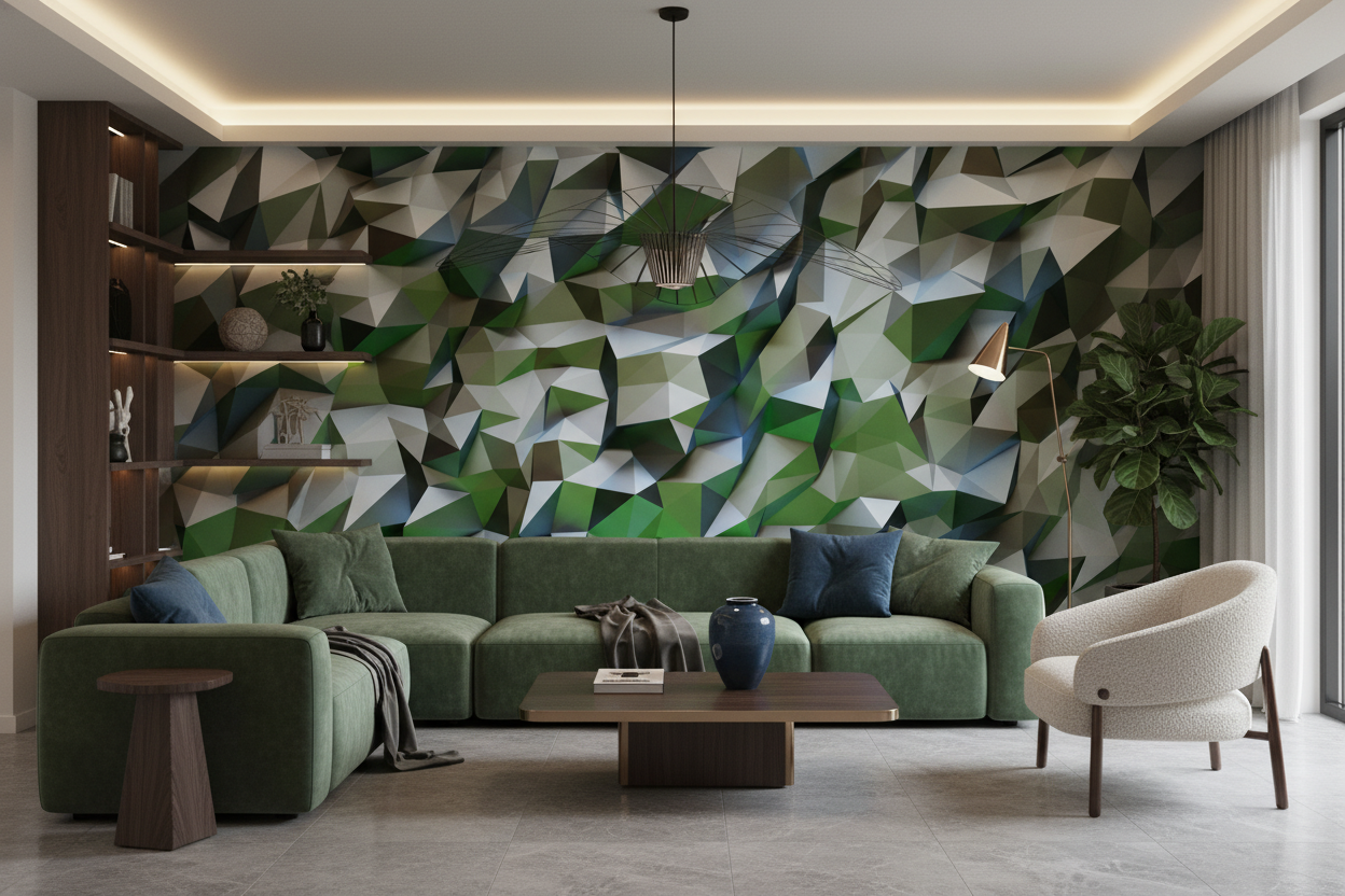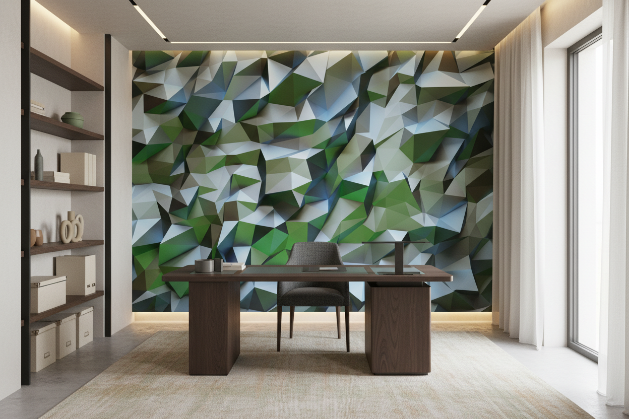 La palette chromatique de ce papier peint moderne puise dans les nuances les plus apaisantes de la nature : des verts émeraude profonds aux verts tendres printaniers, ponctués de bleus cristallins et de blancs immaculés. Ces tons naturels se marient avec délicatesse à des touches de beige et de gris perle, créant un ensemble d’une sophistication remarquable. L’effet tridimensionnel obtenu grâce aux jeux d’ombres et de lumière confère à ce revêtement mural géométrique une profondeur hypnotique.