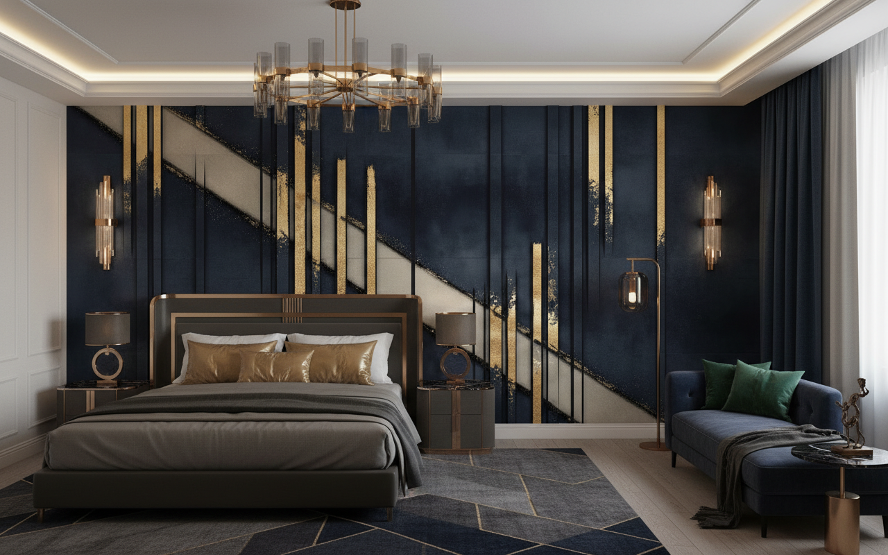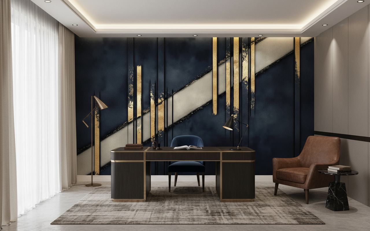 Cette décoration murale d’exception trouvera parfaitement sa place dans un salon moderne en tant que mur d’accent, sublimant votre espace de vie principal. Dans une chambre parentale, il créera une atmosphère cocooning raffinée, particulièrement mis en valeur derrière la tête de lit. Ce papier peint bureau s’harmonise également à merveille dans un espace de travail, apportant inspiration et sérénité. Associez-le à du mobilier design aux lignes épurées, des matières nobles comme le velours bleu nuit, le lin beige ou des accents laiton. Les luminaires dorés et les accessoires déco métallisés viendront parfaire cette ambiance luxe contemporain.