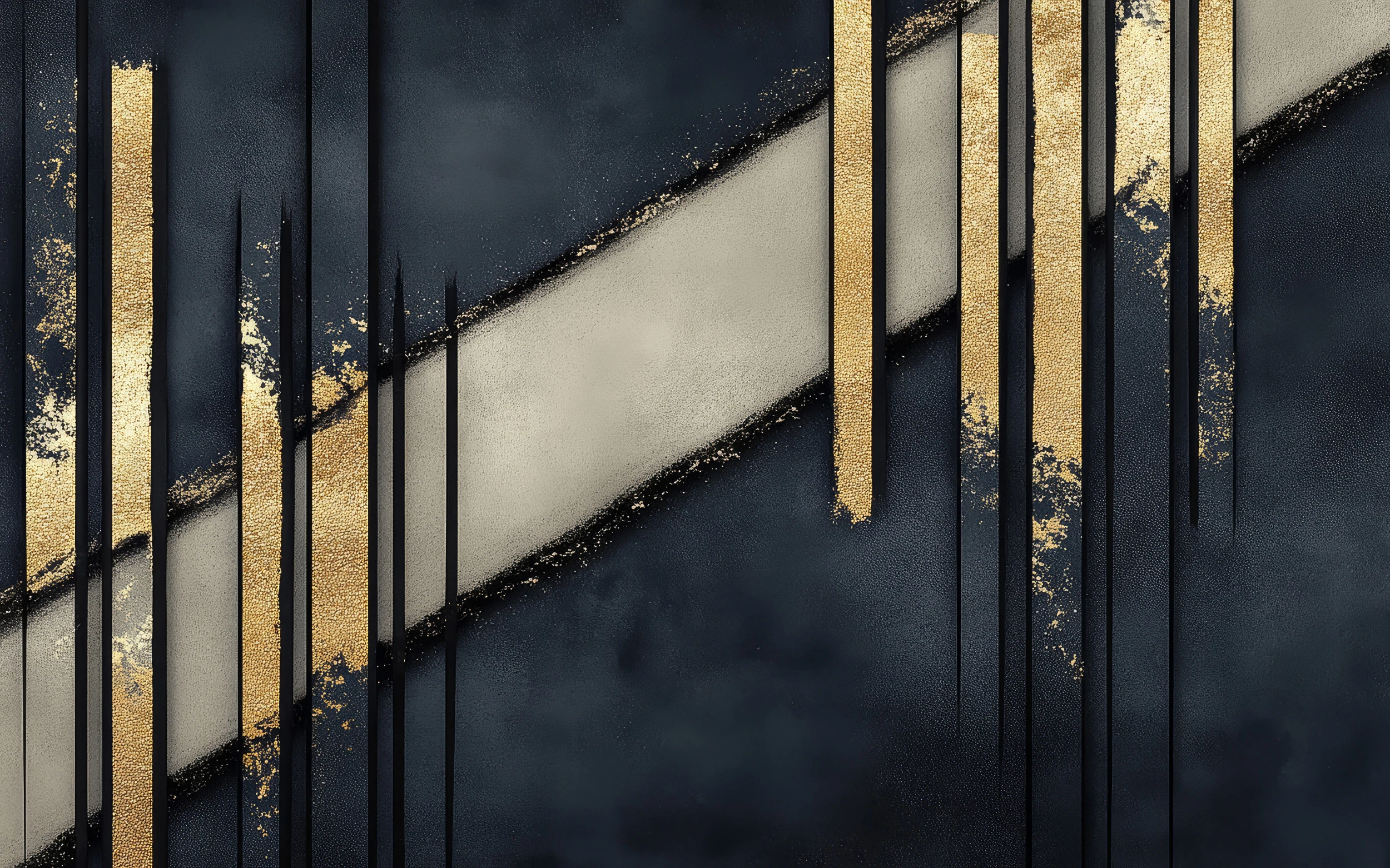 Ce papier peint design révèle une composition abstraite d’une élégance saisissante, orchestrée autour de formes géométriques aux lignes épurées. Les bandes verticales dorées s’élancent majestueusement sur un fond aux nuances bleu nuit et beige nacré, créant un jeu de profondeur fascinant. Ces rayures métallisées captent et reflètent la lumière, apportant une dimension luxueuse à l’ensemble. Les effets de matière subliment cette création : textures poudrées aux accents dorés scintillants, dégradés subtils qui évoquent la poussière d’étoiles, et cette alternance hypnotique entre tons chauds et coloris froids qui confère à ce papier peint son caractère unique.