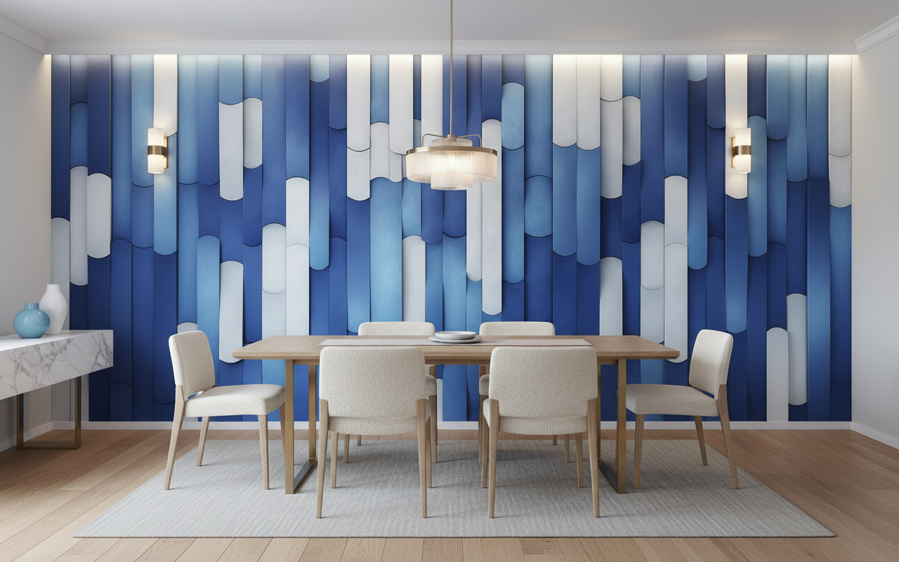 Ce papier peint design trouve sa place idéale dans un salon moderne, où il sublimera un mur d’accent derrière un canapé aux tons neutres. Dans un bureau contemporain, il stimulera la créativité tout en maintenant une atmosphère professionnelle raffinée. Pour une chambre parentale, associez-le à du mobilier scandinave en bois clair et à du linge de maison blanc ou lin naturel. Les matières métalliques comme l’acier brossé ou le laiton créeront un dialogue harmonieux avec les reflets cylindriques. Complétez avec des accessoires déco aux formes géométriques et quelques touches de jaune moutarde ou de terracotta pour réchauffer l’ensemble.