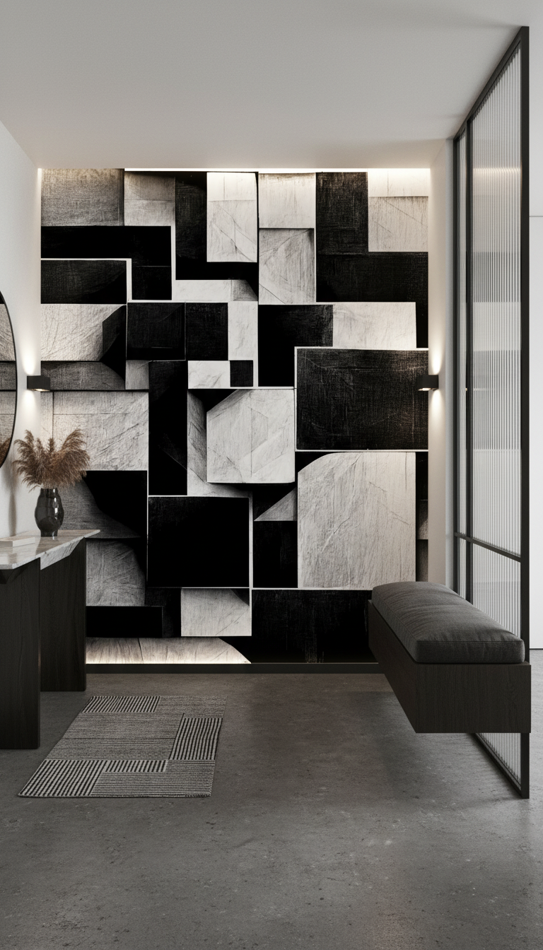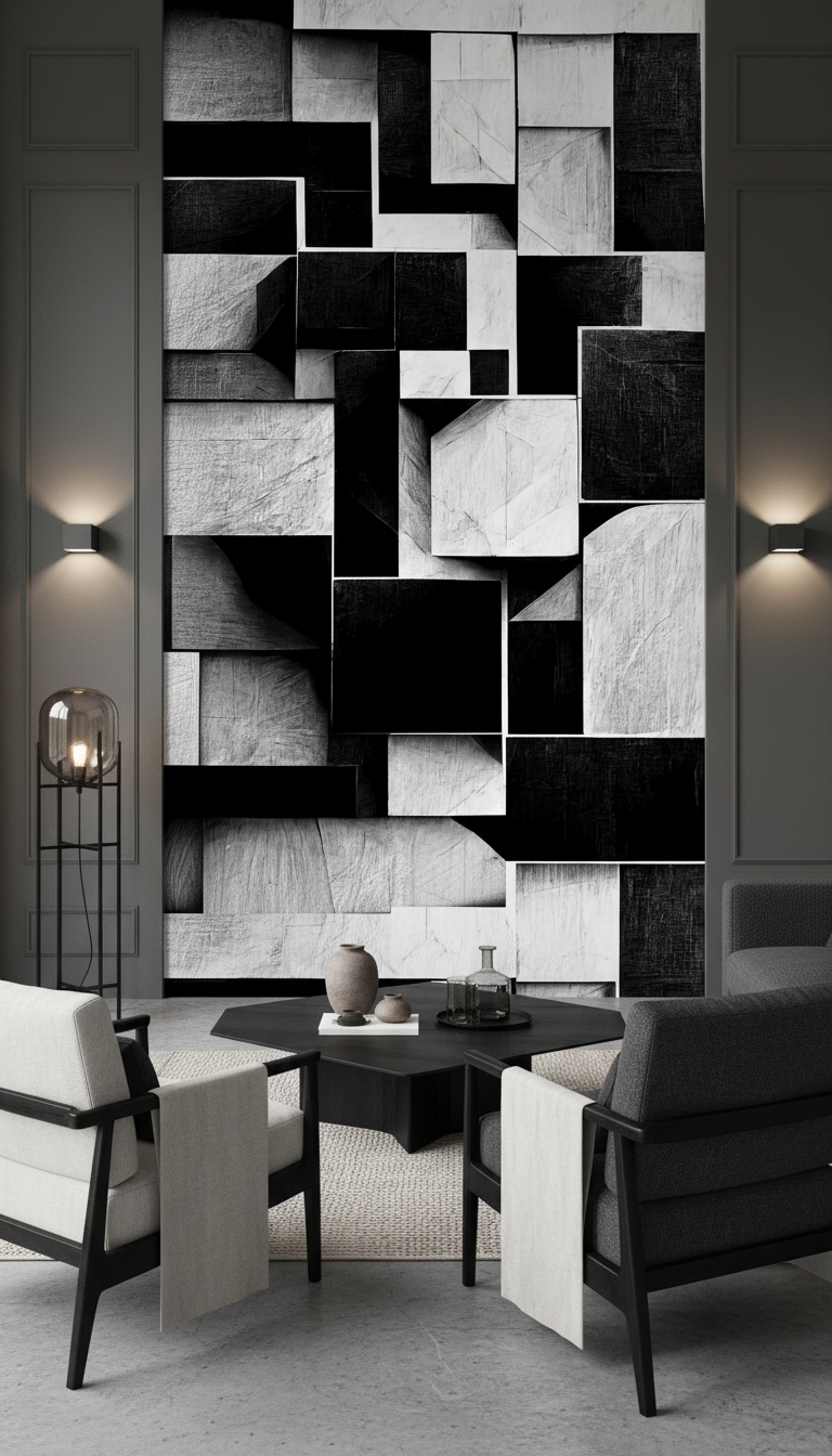 Ce revêtement mural artistique trouve sa place idéale dans un salon contemporain, où il habille avec panache un mur d’accent derrière un canapé aux lignes épurées. Dans un bureau moderne, il stimule la créativité tout en affirmant un caractère professionnel distingué. Une chambre parentale parée de ce motif géométrique devient un cocon design, particulièrement sublimé par l’association avec du mobilier en bois clair, des textiles en lin naturel et des accessoires en métal brossé. Les tons neutres – beige, taupe, blanc cassé – s’harmonisent parfaitement avec cette base monochrome, tandis qu’une touche de couleur vive – jaune moutarde, bleu Klein ou rouge brique – crée un contraste saisissant.