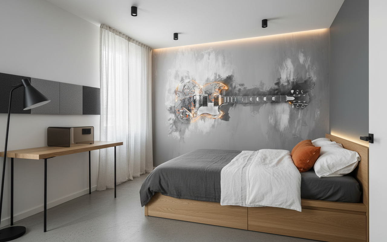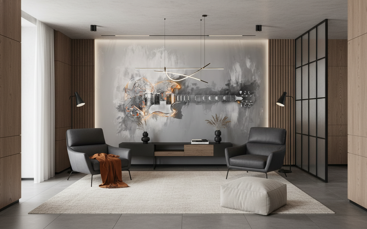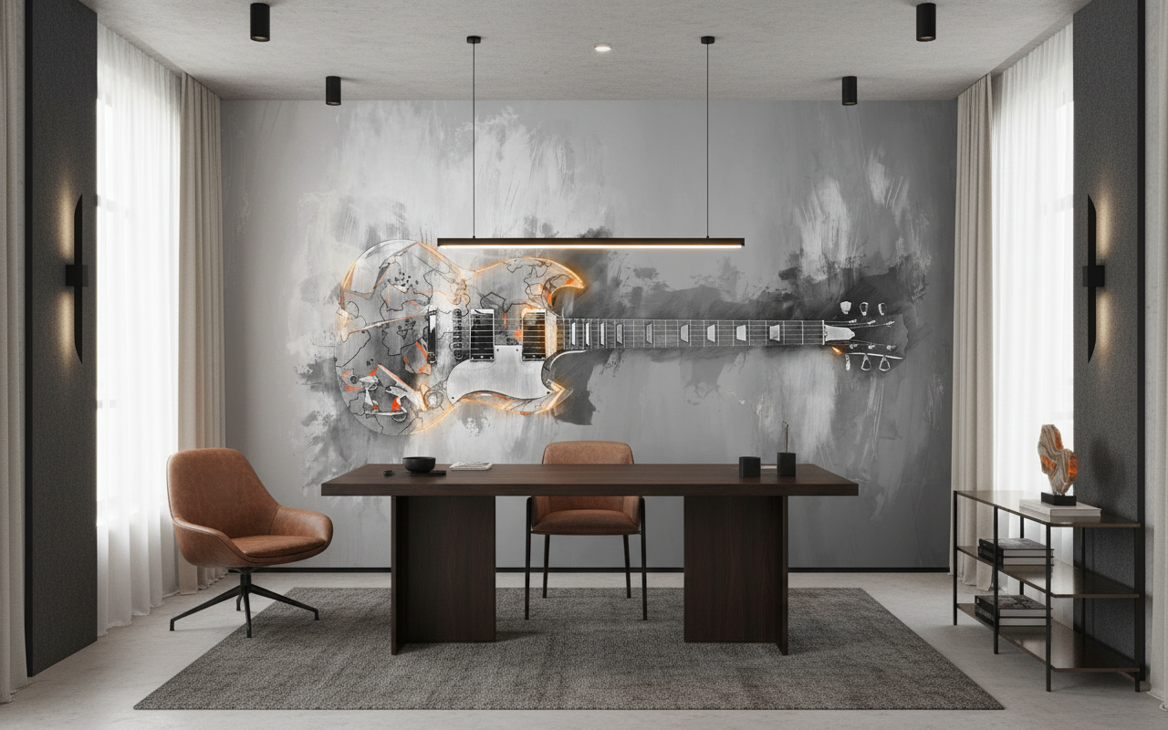 Ce papier peint décoratif trouve naturellement sa place dans un salon moderne, où il constituera un point focal saisissant derrière un canapé en cuir ou une bibliothèque industrielle. Dans un bureau créatif ou un home studio, il insufflera une inspiration constante aux mélomanes et artistes. La chambre d’adolescent passionné de musique sera également métamorphosée par cette présence artistique marquante. Associez-le à du mobilier industriel en métal noir, des étagères en bois brut, ou des accessoires vintage en laiton pour créer un ensemble décoratif cohérent. Les matières naturelles comme le lin écru ou le velours anthracite souligneront parfaitement la sophistication de cette création murale.