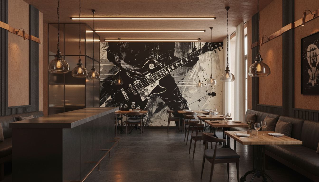 Ce papier peint guitare noir et beige trouve naturellement sa place dans un salon moderne, où il transformera un mur en véritable œuvre d’art contemporaine. Il sublimera également une chambre d’adolescent mélomane, un bureau créatif ou encore un espace détente dédié à la musique. Pour l’accompagner, privilégiez un mobilier aux lignes industrielles : métal brut, cuir patiné, bois sombre. Des accessoires vintage comme des vinyles encadrés ou des objets musicaux chinés viendront parfaire l’ambiance. Les matières naturelles comme le lin anthracite ou les textiles en jute apporteront douceur et chaleur à cet univers rock chic.